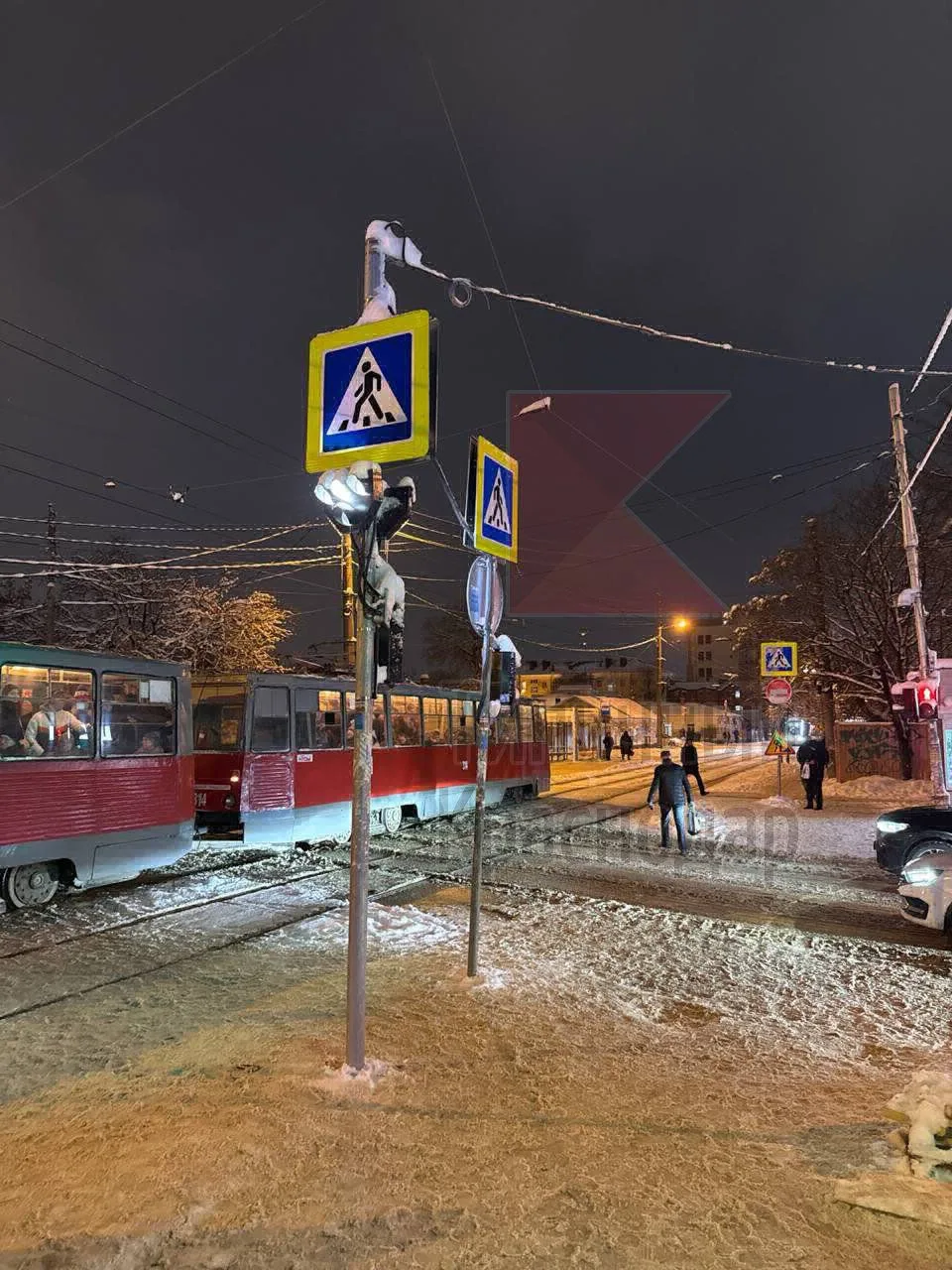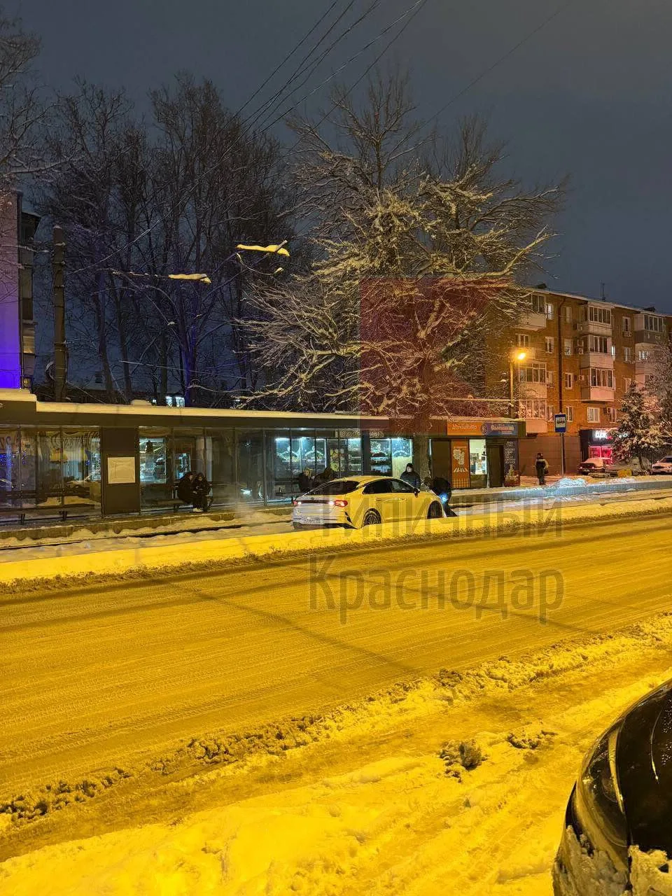 Стоят трамваи на стадионе Кубань – машина застряла на рельсах.