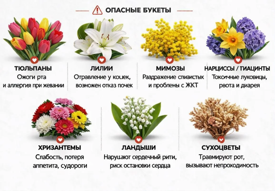 Листья гиацинтов, ирисы, ландыши и пыльца лилий ядовиты для пушистых. А тюльпаны, пионы и хризантемы провоцируют аллергический дерматит, судороги и сердечную недостаточность.