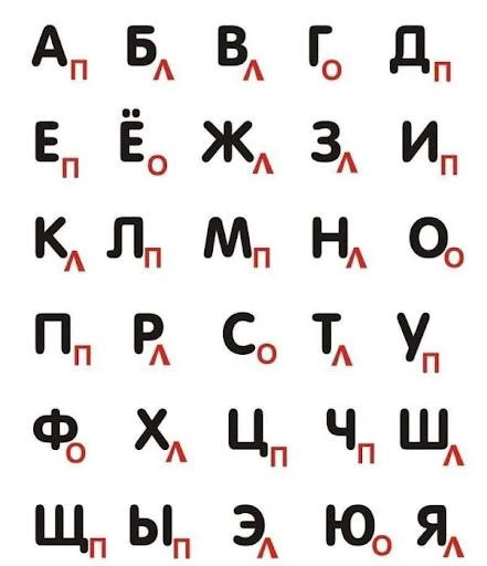 Ребенок произносит верхнюю букву в паре и поднимает правую руку, если снизу буквы «П» и левую руку, если снизу буква «Л». Если снизу буква «О», то одновременно поднимает обе руки.