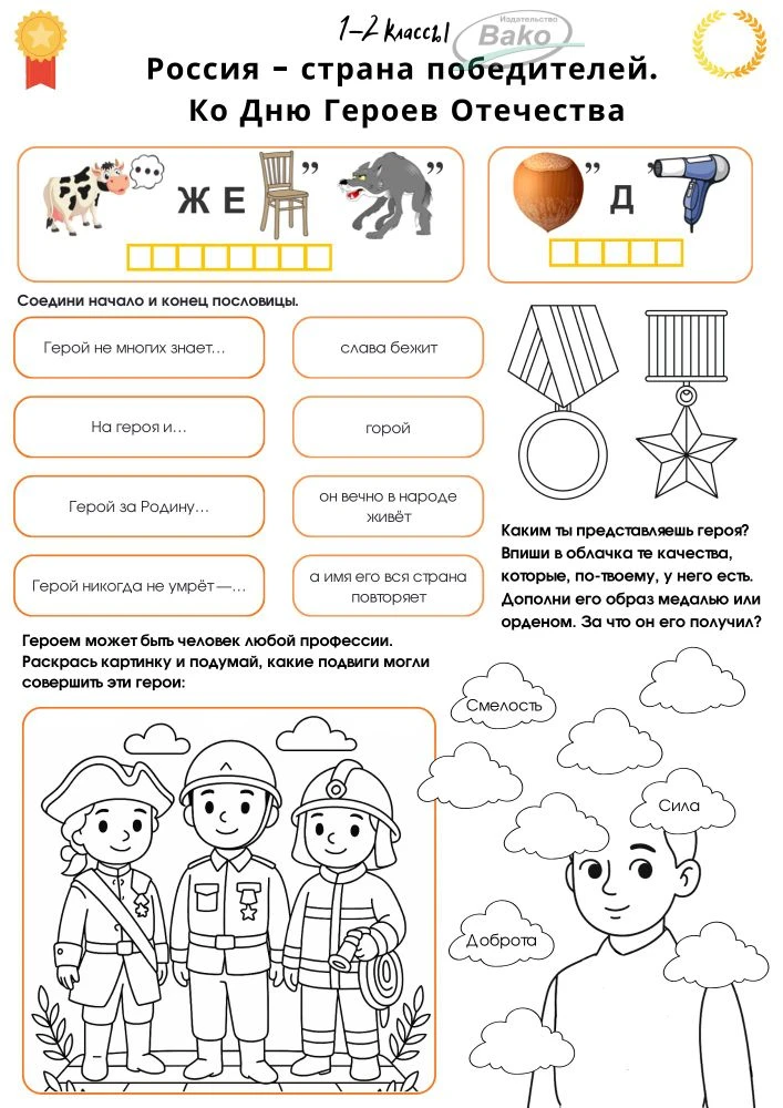 Примеры фраз:* «Герой за Родину горой», «Сам погибай, а товарища выручай». Тот, кто расшифровал первым, поднимает руку. В конце хором читают пословицу.