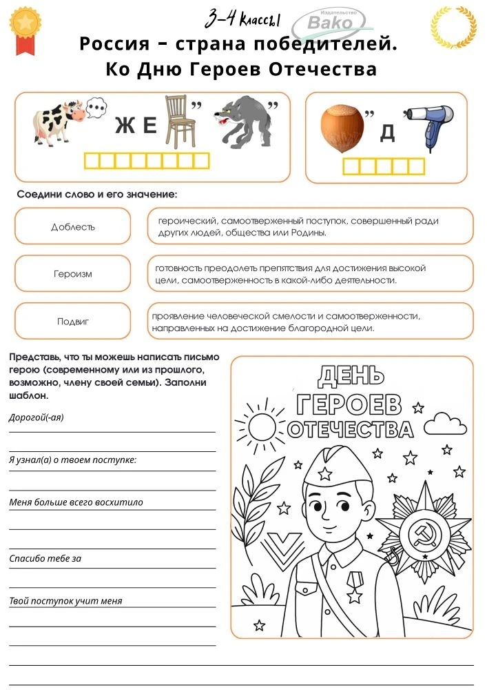 Задача: найти правильный контур среди похожих или раскрасить шаблон по памяти (какого цвета ленточка? сколько лучей у звезды? золотая она или серебряная?). Это тренирует внимание к деталям, важным для истории.