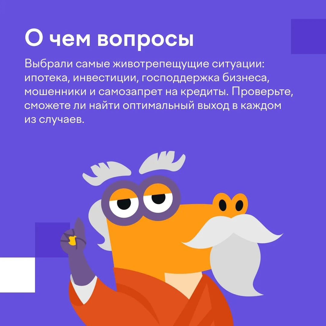 Мы подумали: а ведь про работу бизнеса, кредиты, накопления и способы борьбы с мошенниками должны знать не только дети. Поэтому вместе с Банком России и нацпроектом «Эффективная и конкурентная экономика» сделали тест и для родителей.