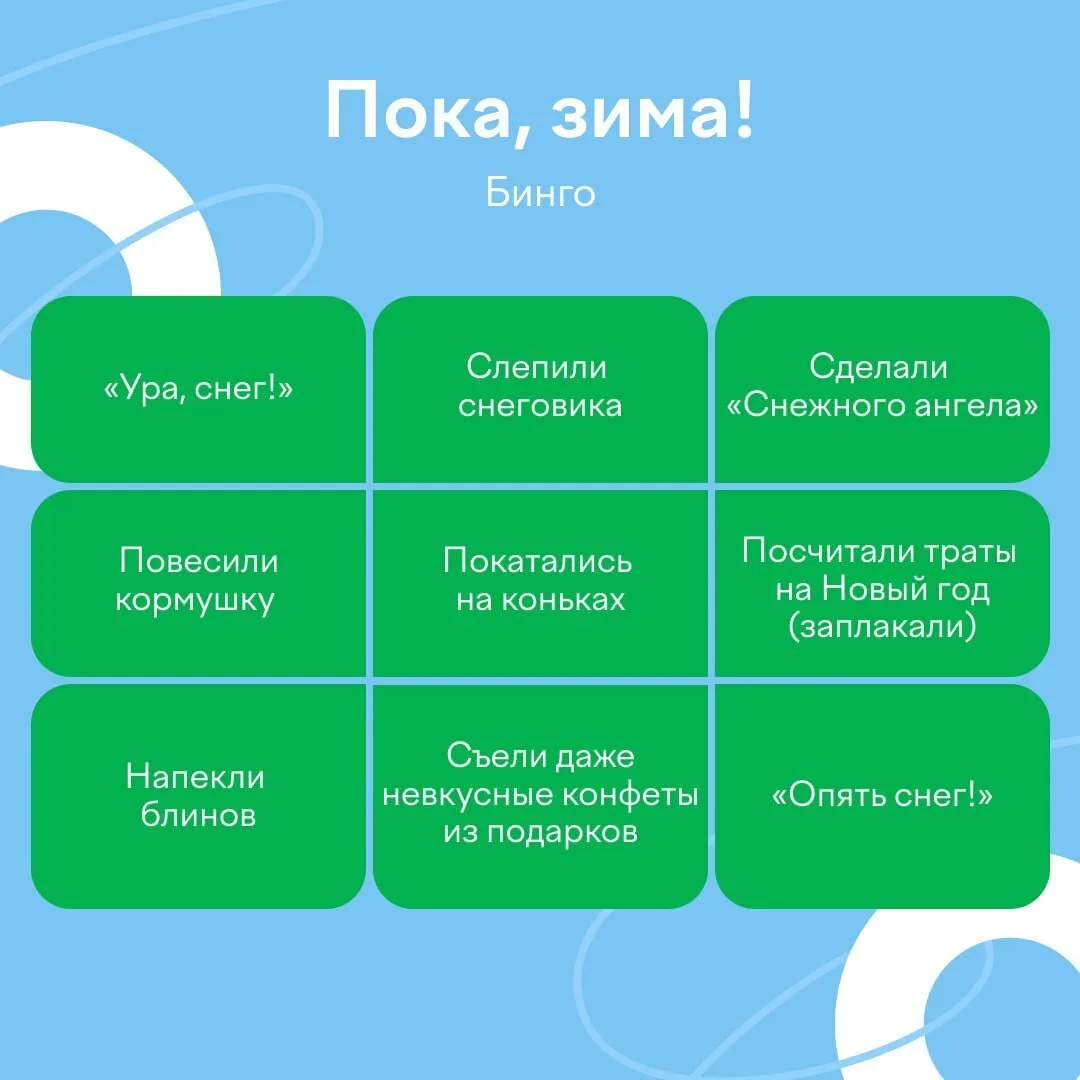Давайте же попрощаемся с холодной, темной, снежной зимой и вспомним, какой она была. Заполняйте бинго о том, чем эти три месяца запомнились вам.