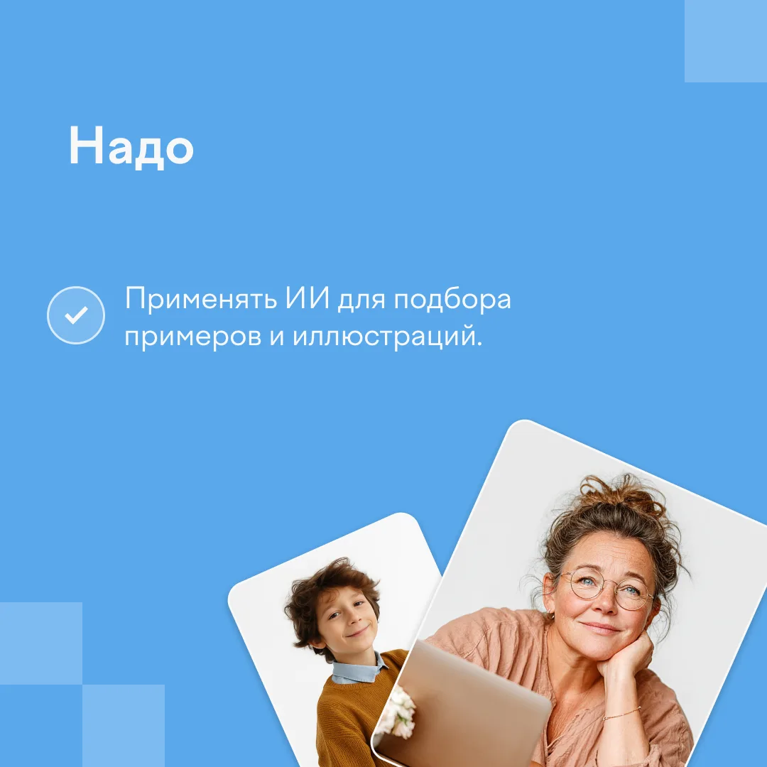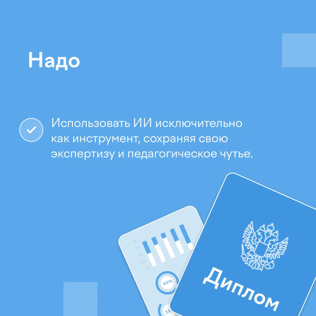 Часто пользуетесь ИИ в работе? Наши карточки помогут сделать технологии поддержкой, а не помехой. И напоминаем про сервис «Подготовка к уроку», который, как и нейросети, позволяет учителям совершенствовать занятия и экономить время. Собрали в нем презентации, раздаточные материалы и даже варианты домашки для каждого класса и по любому предмету. Попробуйте: https://vk.cc/cR5fSF
