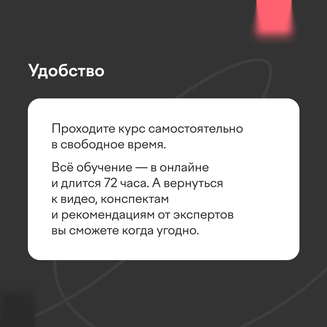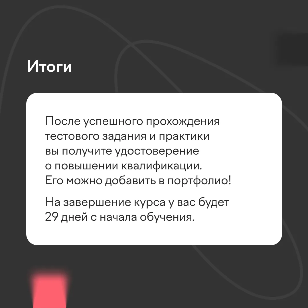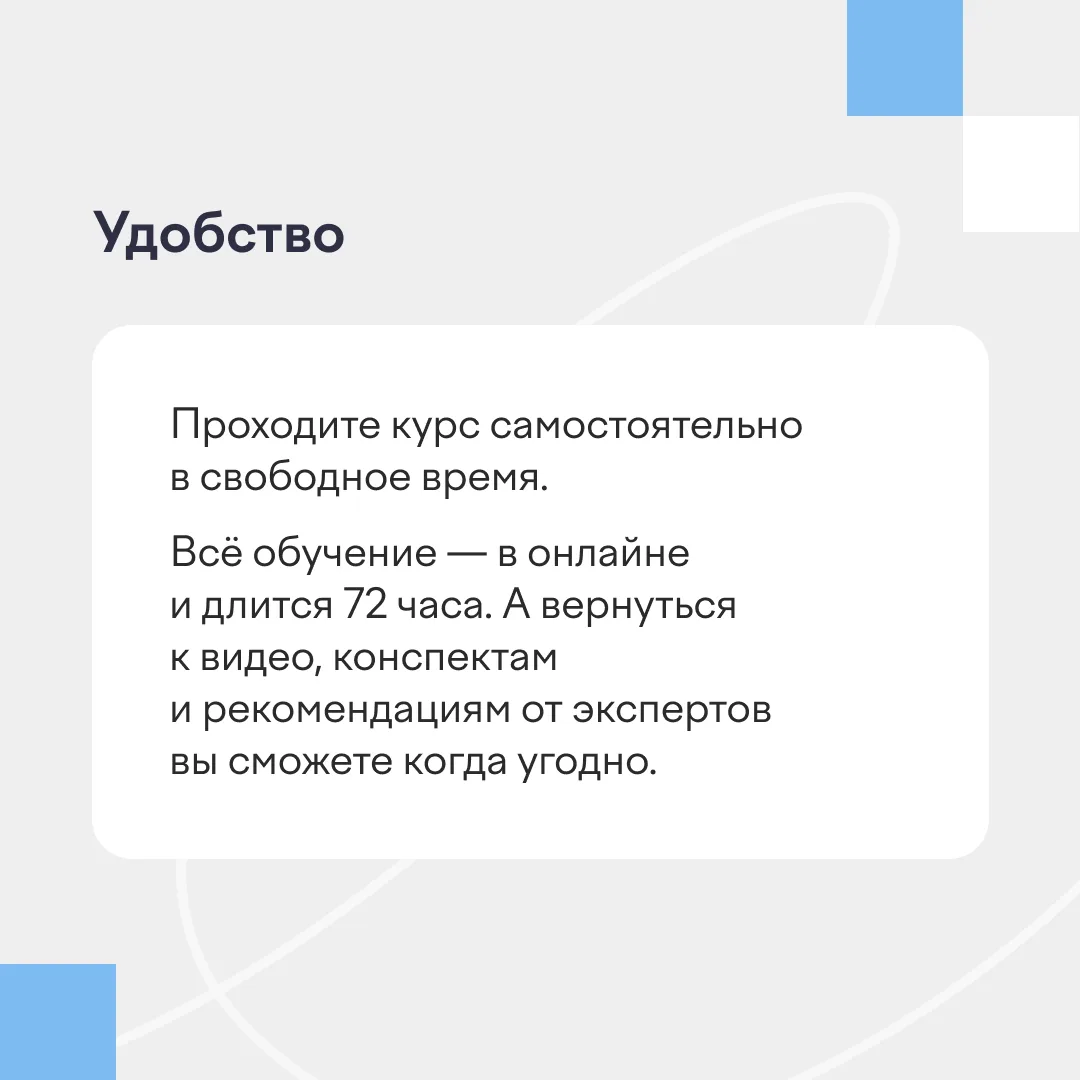 В карточках рассказали, что вас ждет на курсе, как он будет проходить и что можно получить после.