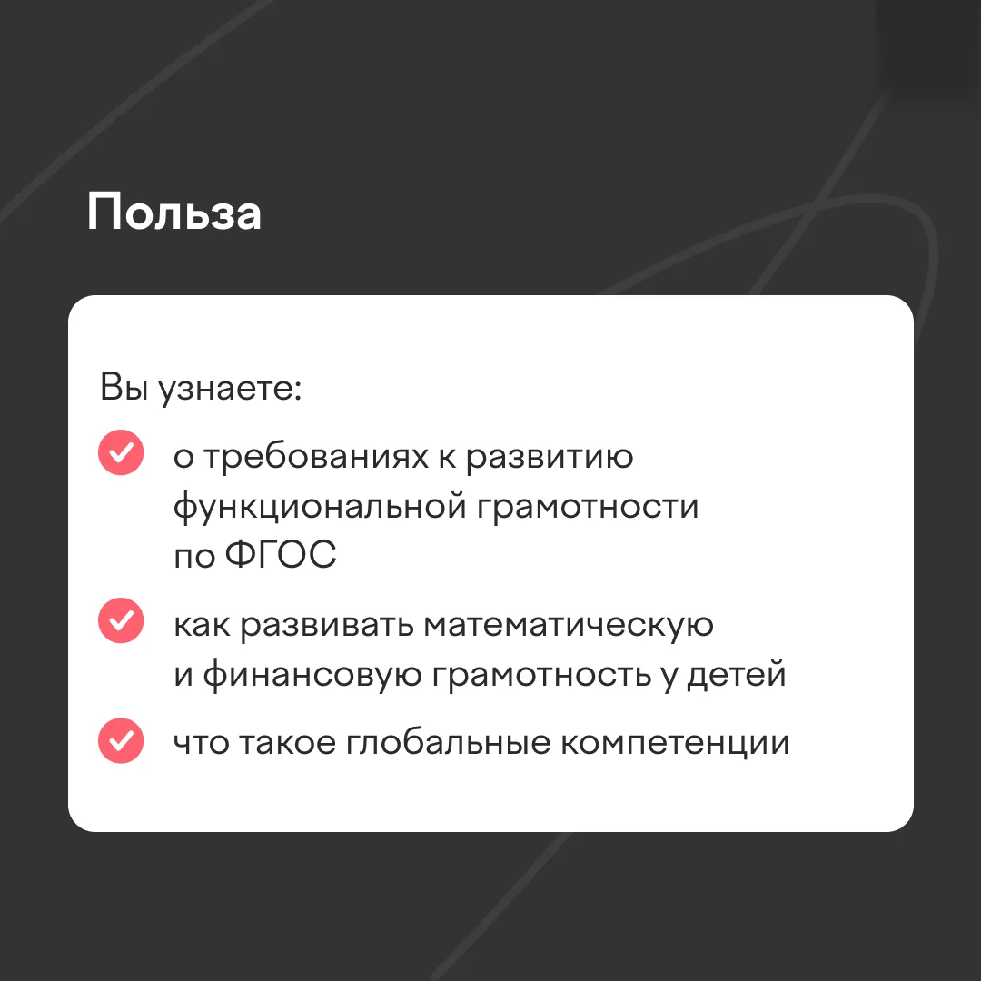 Финансовая, математическая, функциональная, естественно-научная — какой только грамотности сегодня не бывает! И всему этому надо учить детей, желательно с первого класса. Как найти время на отработку навыков, если вы учитель начальной школы или предметник? Рассказываем на курсе повышения квалификации «Функциональная грамотность: как применять знания в жизни».