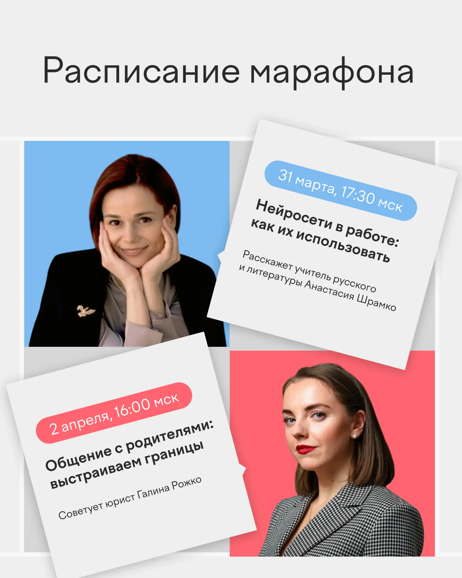 Встречи мы проводим каждый день, темы обсуждаем разные: от личных границ до нейросетей. В карточках — четыре вебинара, которые пройдут в ближайшее время.