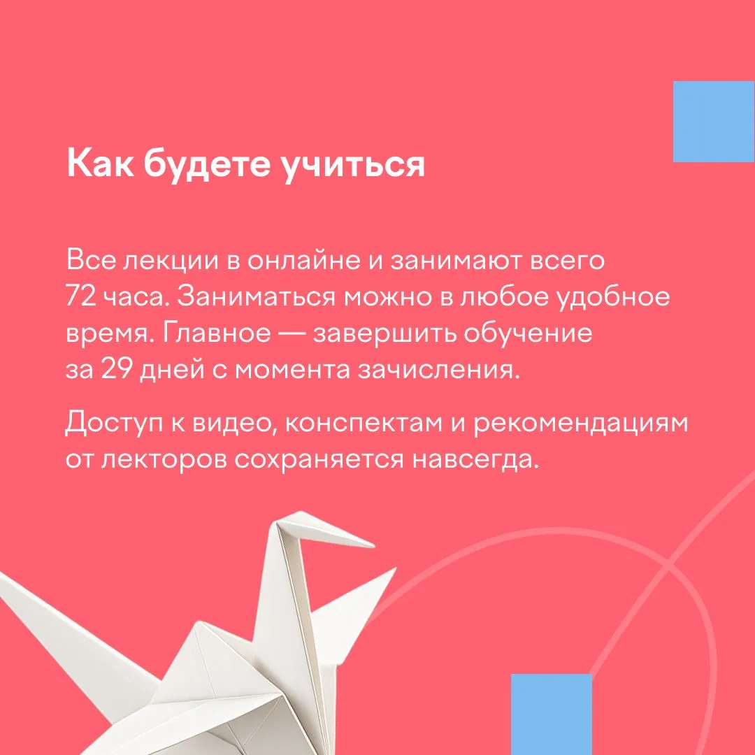 Обучение стартует 26 ноября, длится 29 дней. За это время вы пройдете четыре модуля, выполните тестовое и практическое задания. Никуда ездить и менять свой график не надо: лекции можно смотреть онлайн когда вам удобно.
