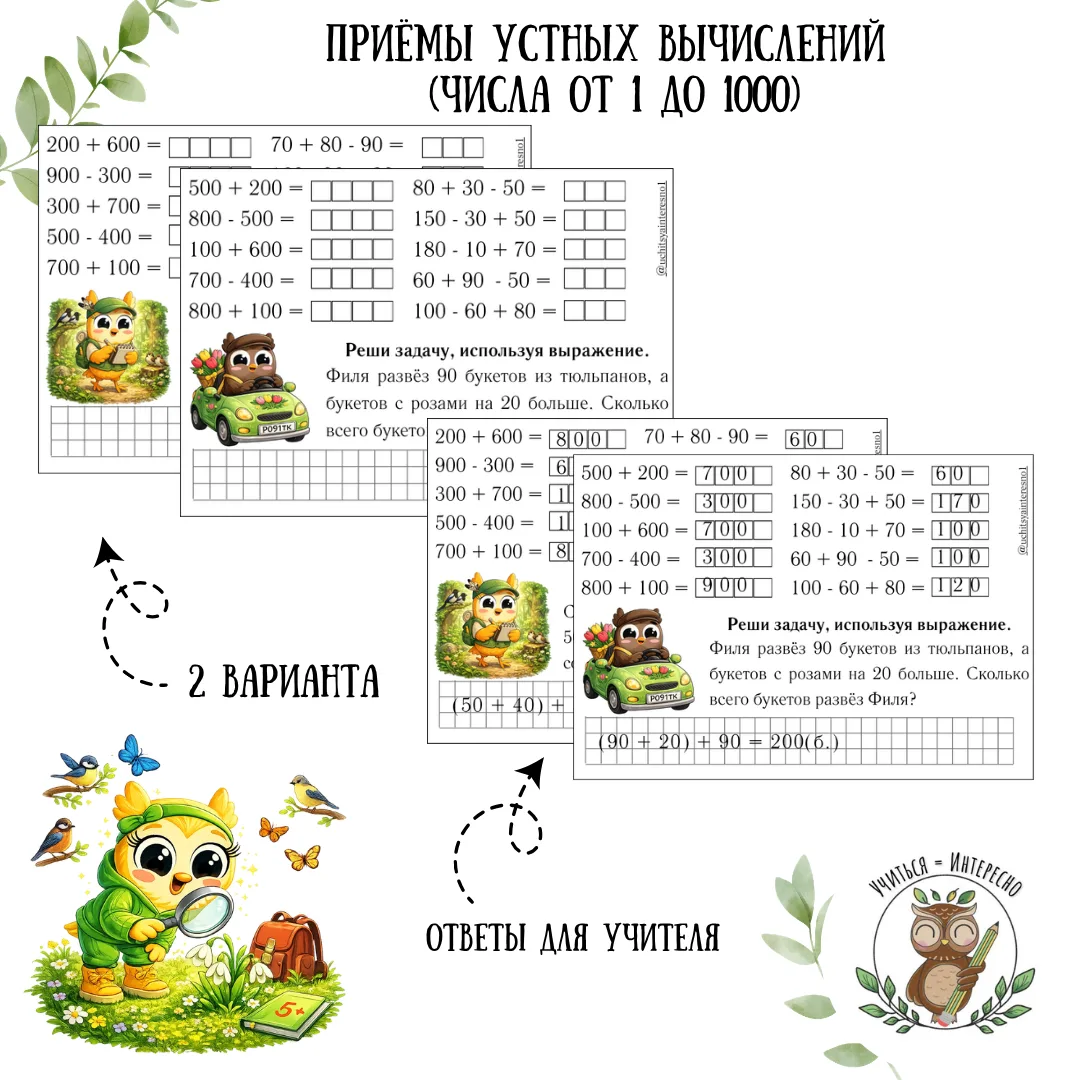 Делюсь с вами карточкой на отработку умения складывать и вычитать устно. В заданиях вычисления в пределах 1000.