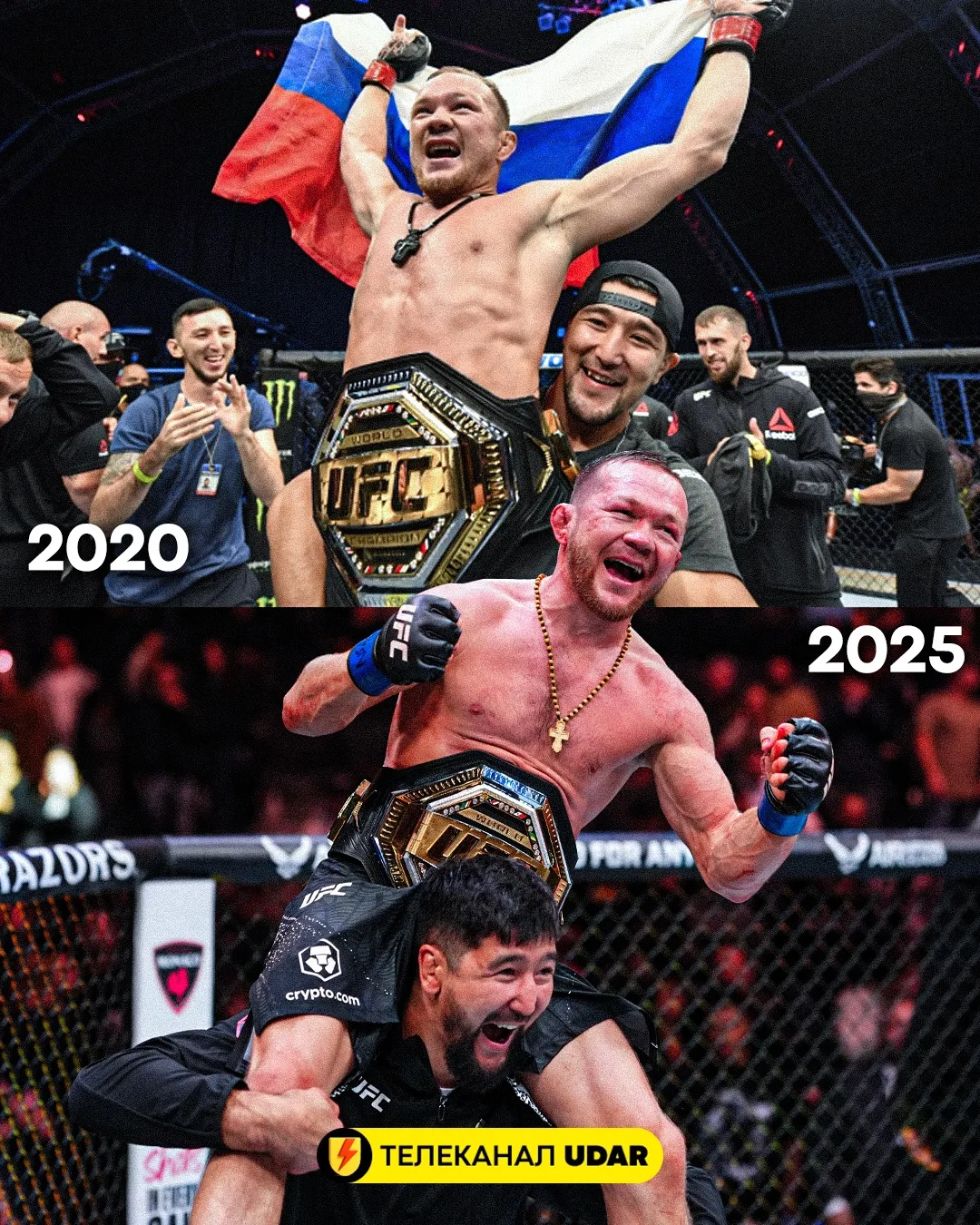 На фото - та самая связка, которая по-настоящему работает: Петр Ян и Ильяс Хамзин вместе поднимали пояс UFC в 2020 году. История повторяется.
