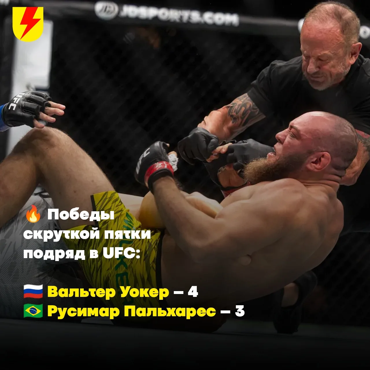 👏Предыдущий рекорд по количеству скрученных пяток подряд принадлежал большому мастеру этого ремесла, Русимару Пальхаресу. До Вальтера именно он побеждал этим приемом трижды подряд. Теперь этот рекорд бит! Но вперед еще один – Русимар побеждал скруткой 5 раз в UFC, у Уокера таких побед уже 4. Ждем новый рекорд!