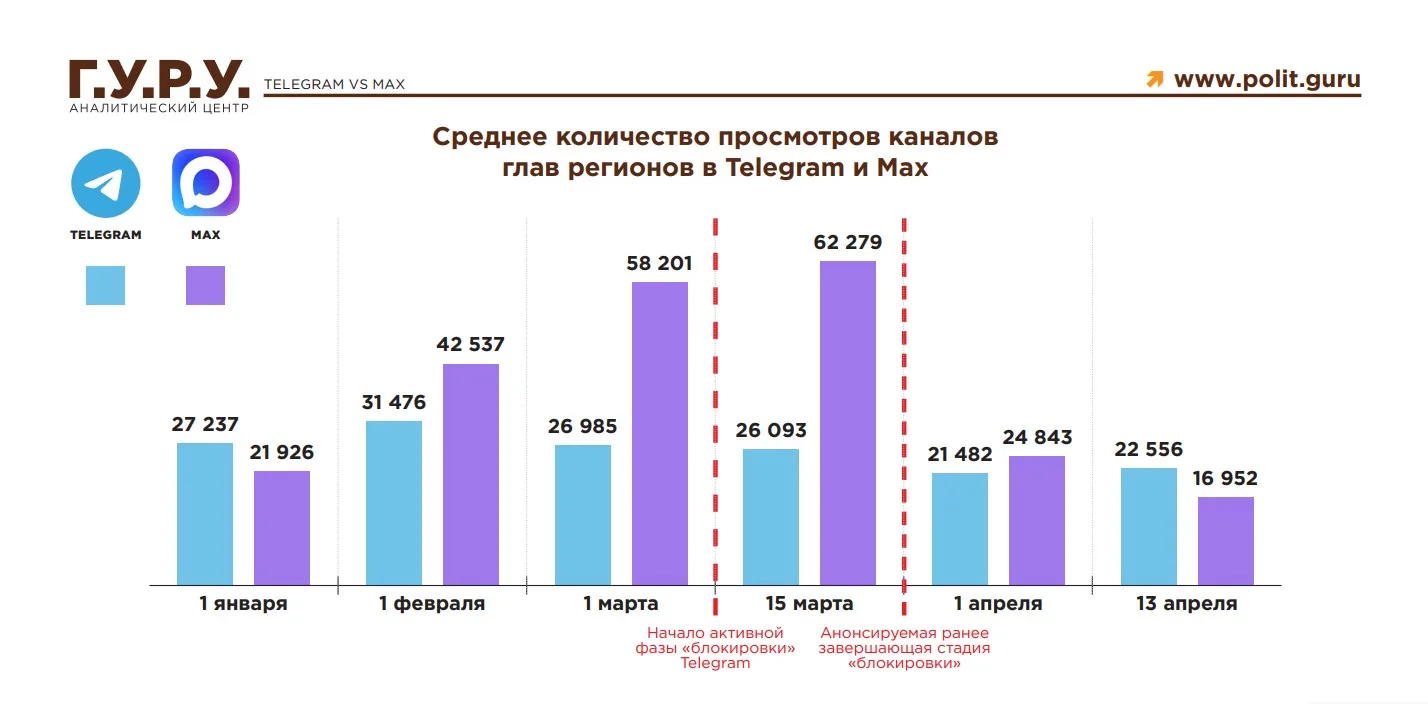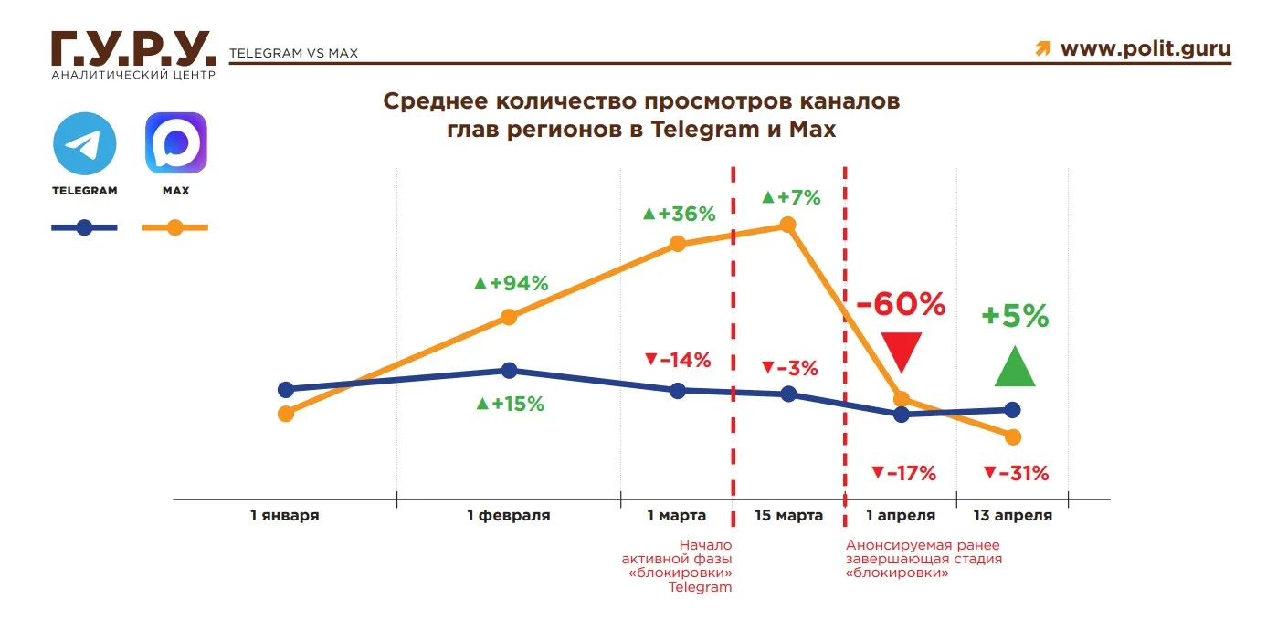 «Нейросетевой анализ медиа активности каналов губернаторов в мессенджерах Max и Telegram выявил крайне примечательную разнонаправленную тенденцию. После начала активной фазы "замедления" Telegram силами РКН с 15 марта по 1 апреля среднее количество просмотров публикаций каналов глав регионов упало в обоих мессенджерах: в Telegram упало на 17%, в Max — рухнуло на 60%; при этом на новом двухнедельном цикле с 1 апреля по 13 апреля Telegram уже частично отыграл падение, обеспечив прирост на 5%, а Max продолжил свое вертикальное падение, обвалившись ещё на 31%. Есть основания говорить, что аудитория адаптируется к "новой цифровой нормальности" и возвращается в Telegram», — пишут аналитики агентства.