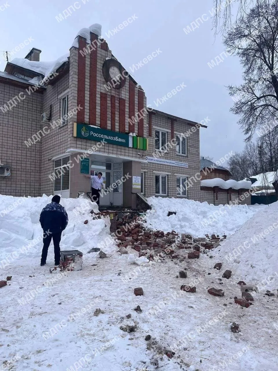 С кровли здания в поселке Ува снежные массы сошли вместе с частью кирпичной кладки.