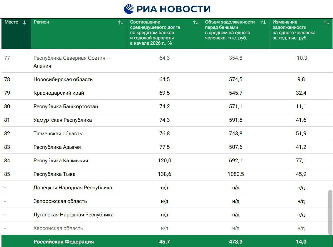 На каждого работающего жителя на начало 2026 года приходится почти 600 тыс. рублей кредитов — или три четверти годовой зарплаты, показало исследование РИА Новости.