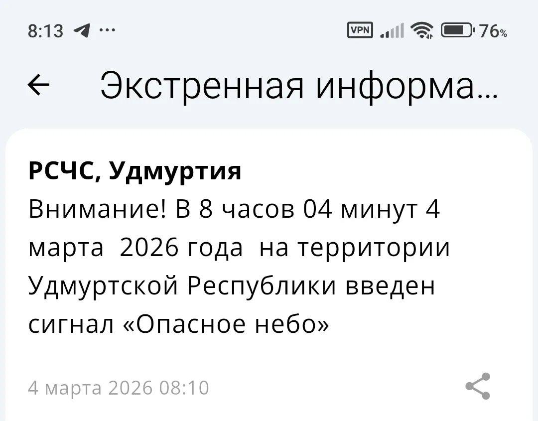 ❗️В 01:30 4 марта на территории Удмуртии дан отбой сигнала «Ракетная опасность».