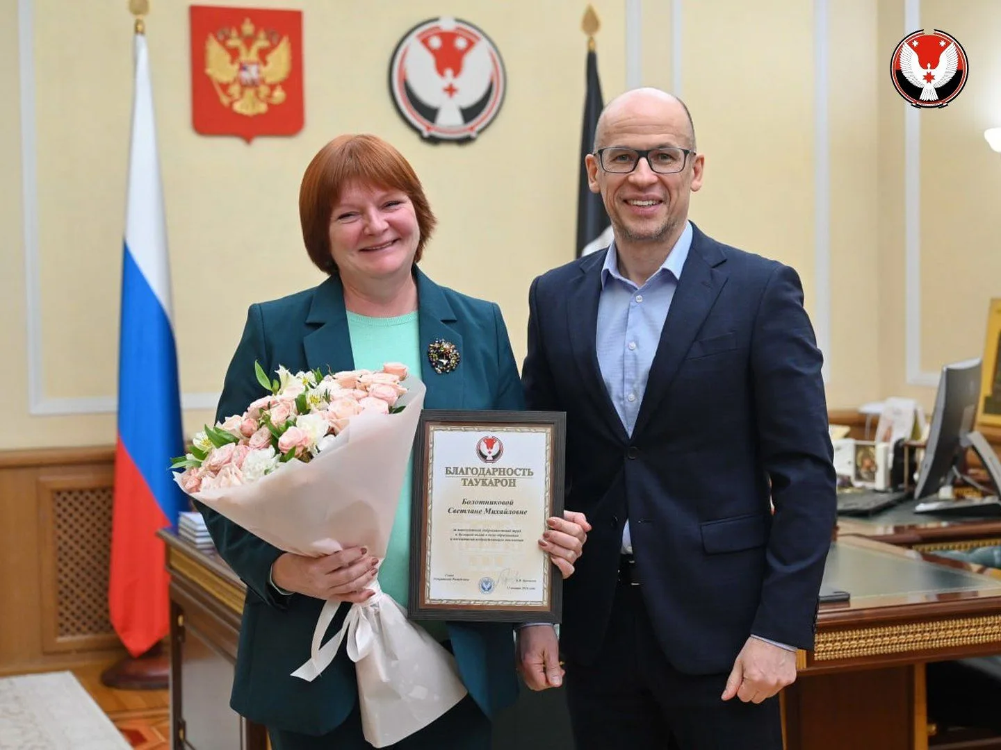 Глава Удмуртии Александр Бречалов поблагодарил Светлану Михайловну за многолетний труд, значительный личный вклад в развитие системы образования региона и вручил благодарность.