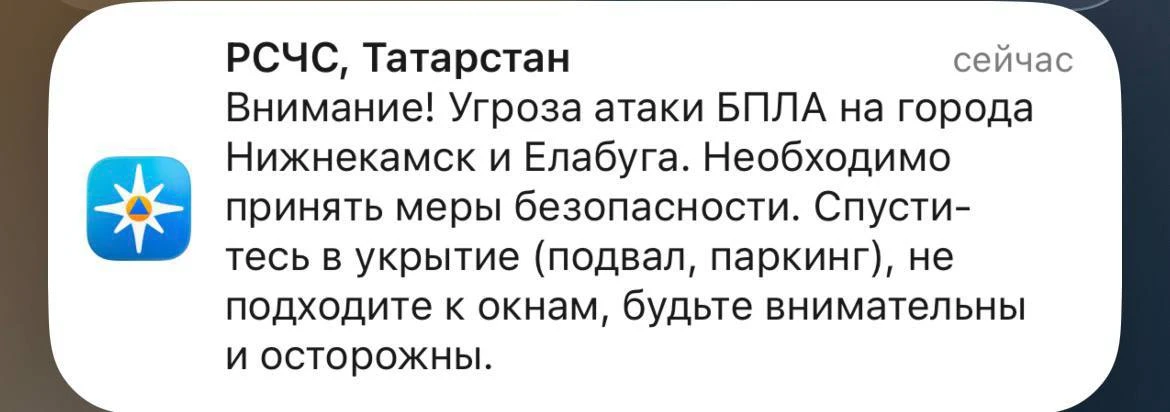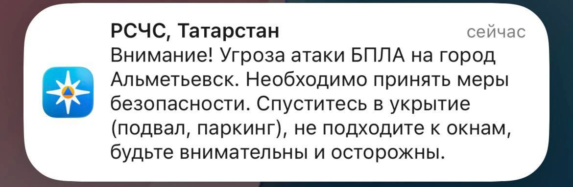 ❗️ Вслед за Казанью жителей соседнего Альметьевска из-за угрозы атаки БПЛА также просят спрятаться в укрытие