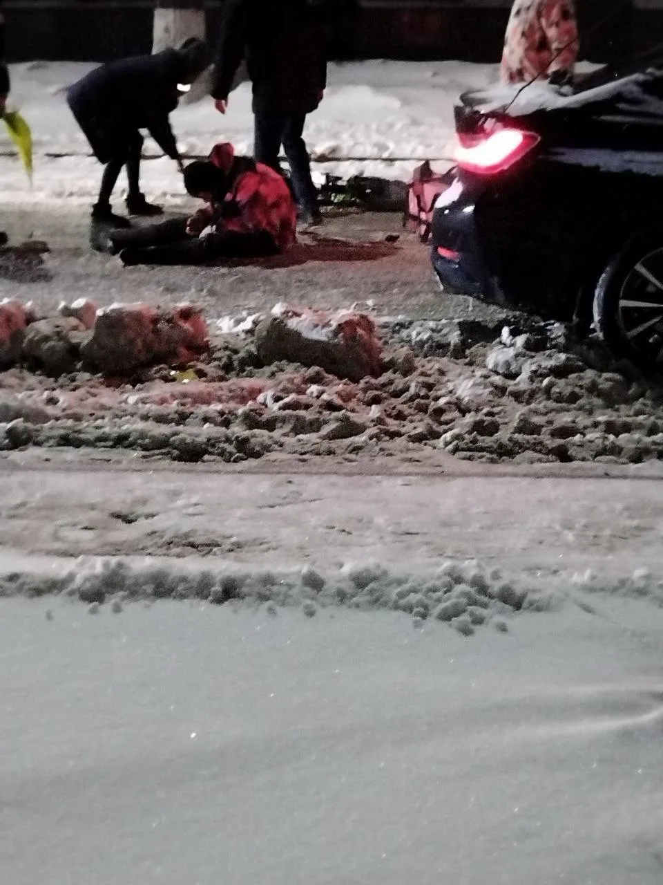 Случайные прохожие бросились на помощь пострадавшему. Он в сознании, но, видимо, получил травму головы, из раны идет кровь.