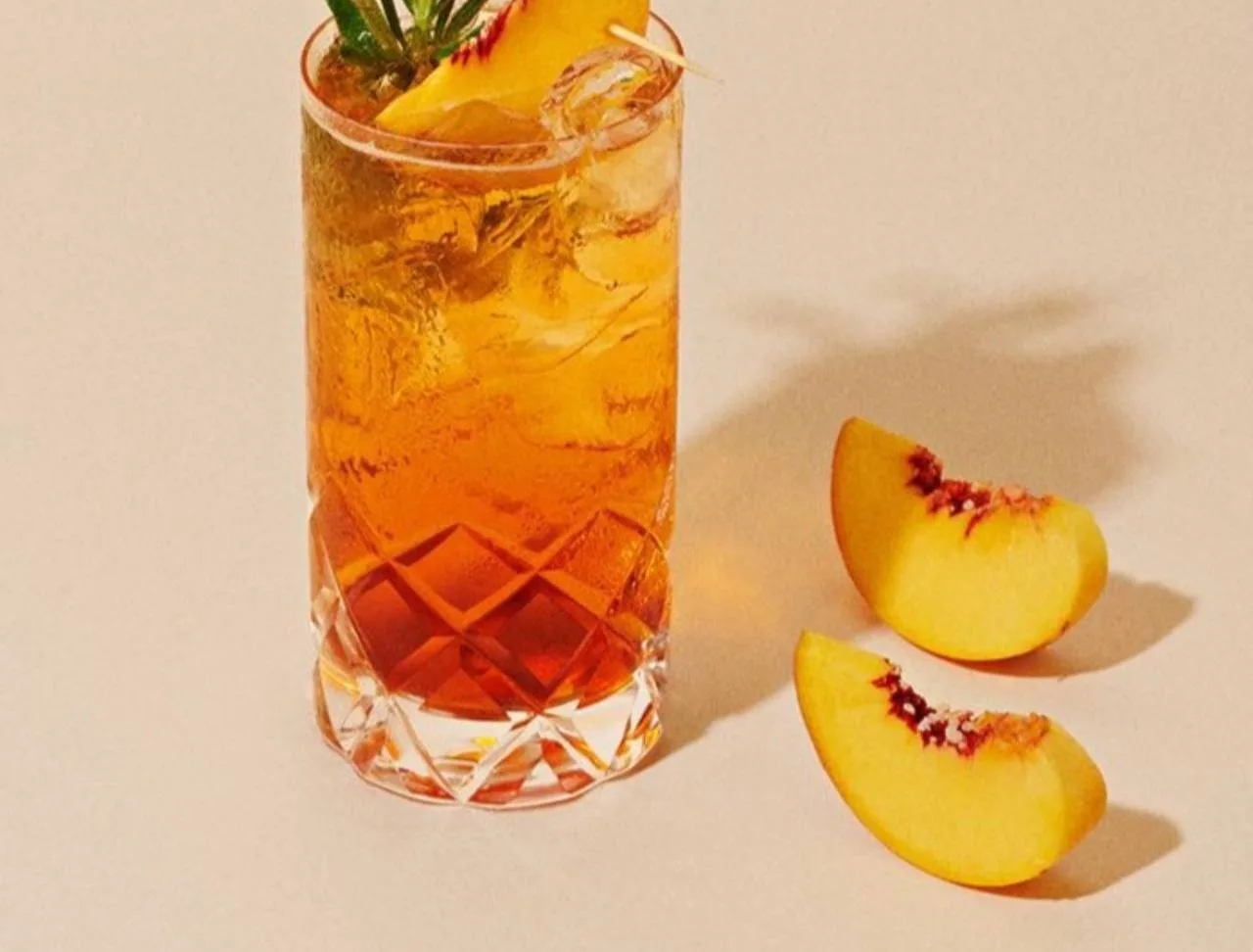Выжмите сок из 1 персика, а второй нарежьте на небольшие дольки. Добавьте сок в чай и сразу уберите сотейник с огня. Выложите в стакан мяту и дольки персика, добавьте корицу. Чай готов.