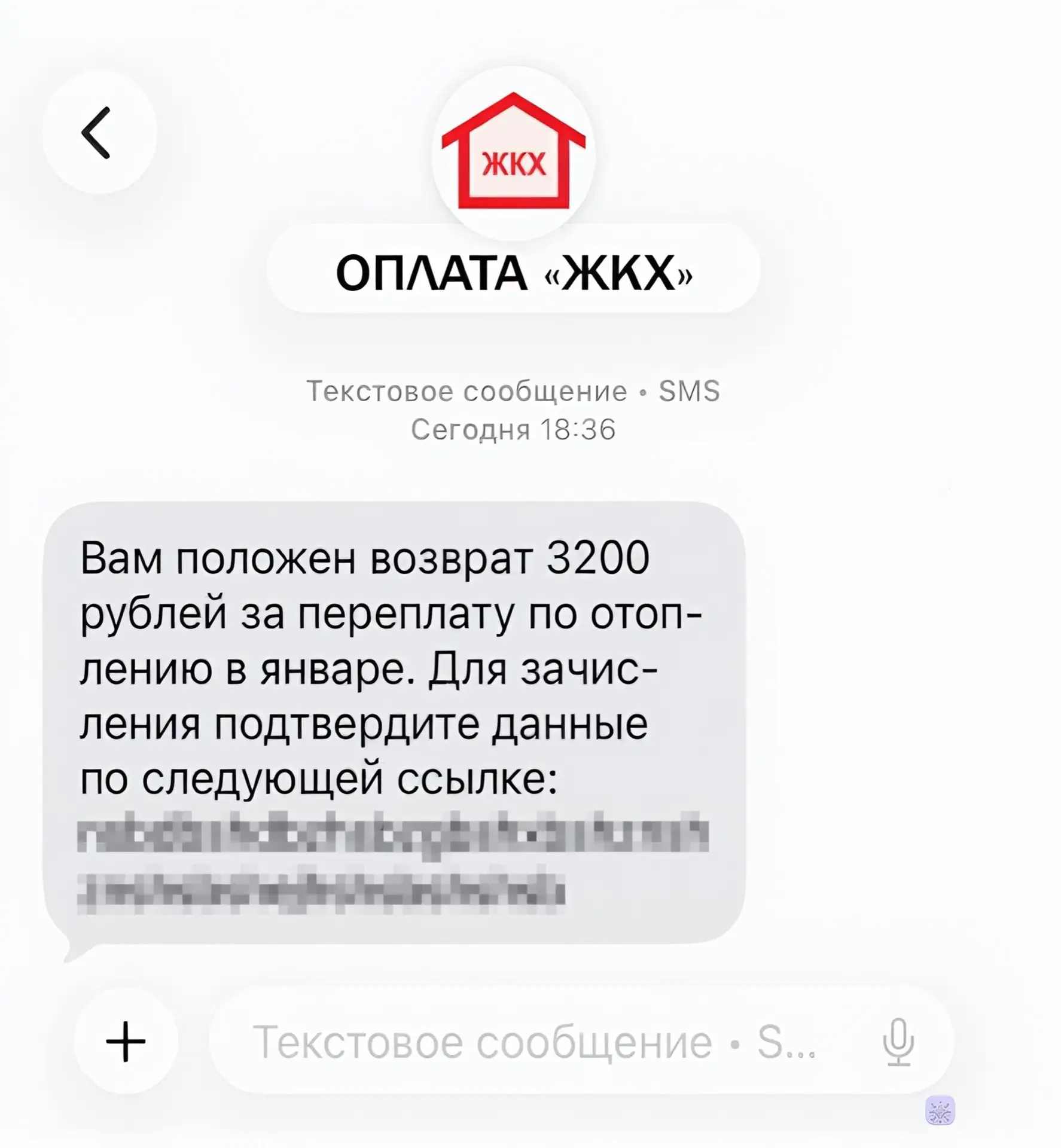 "Вам положен возврат 3200 рублей за переплату по отоплению в январе. Для получения перевода подтвердите данные по ссылке"
