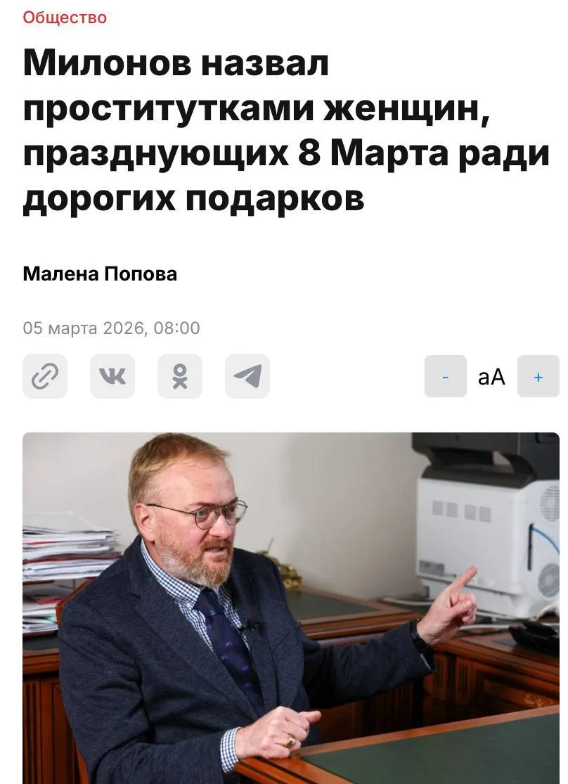 Депутат Милонов заявил, что дарение дорогих подарков искажает изначальный смысл праздника про равноправие и формирует «проституточные отношения».