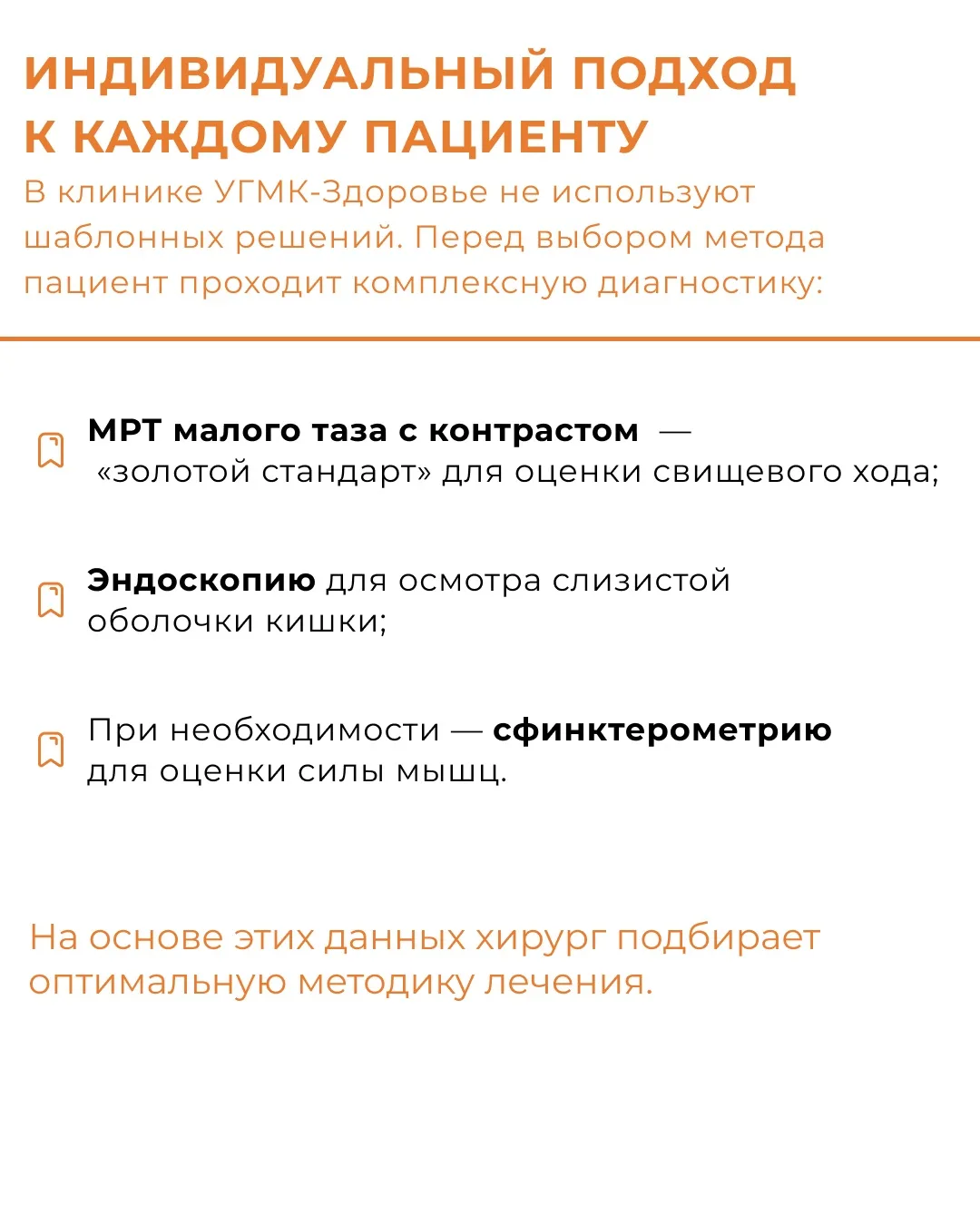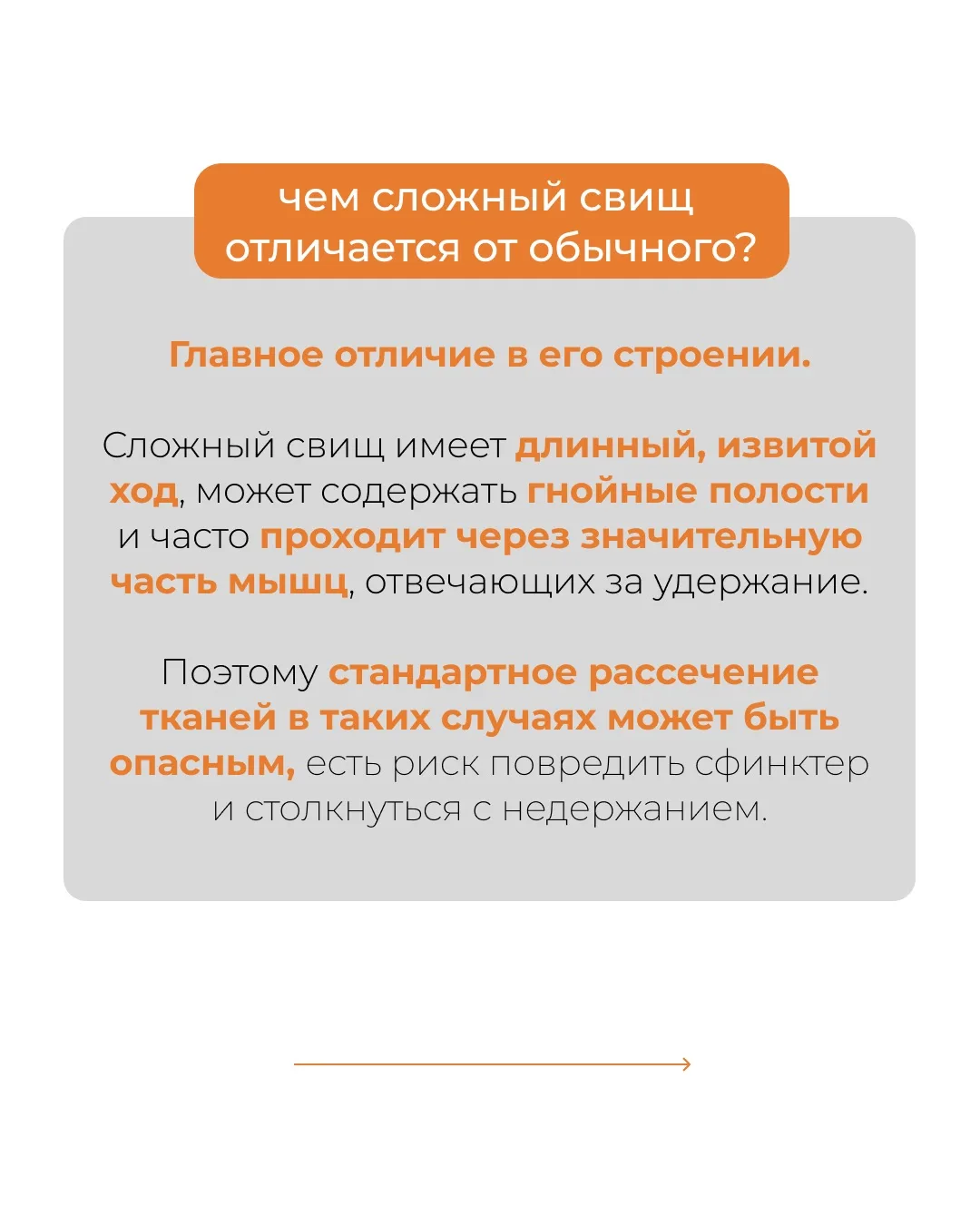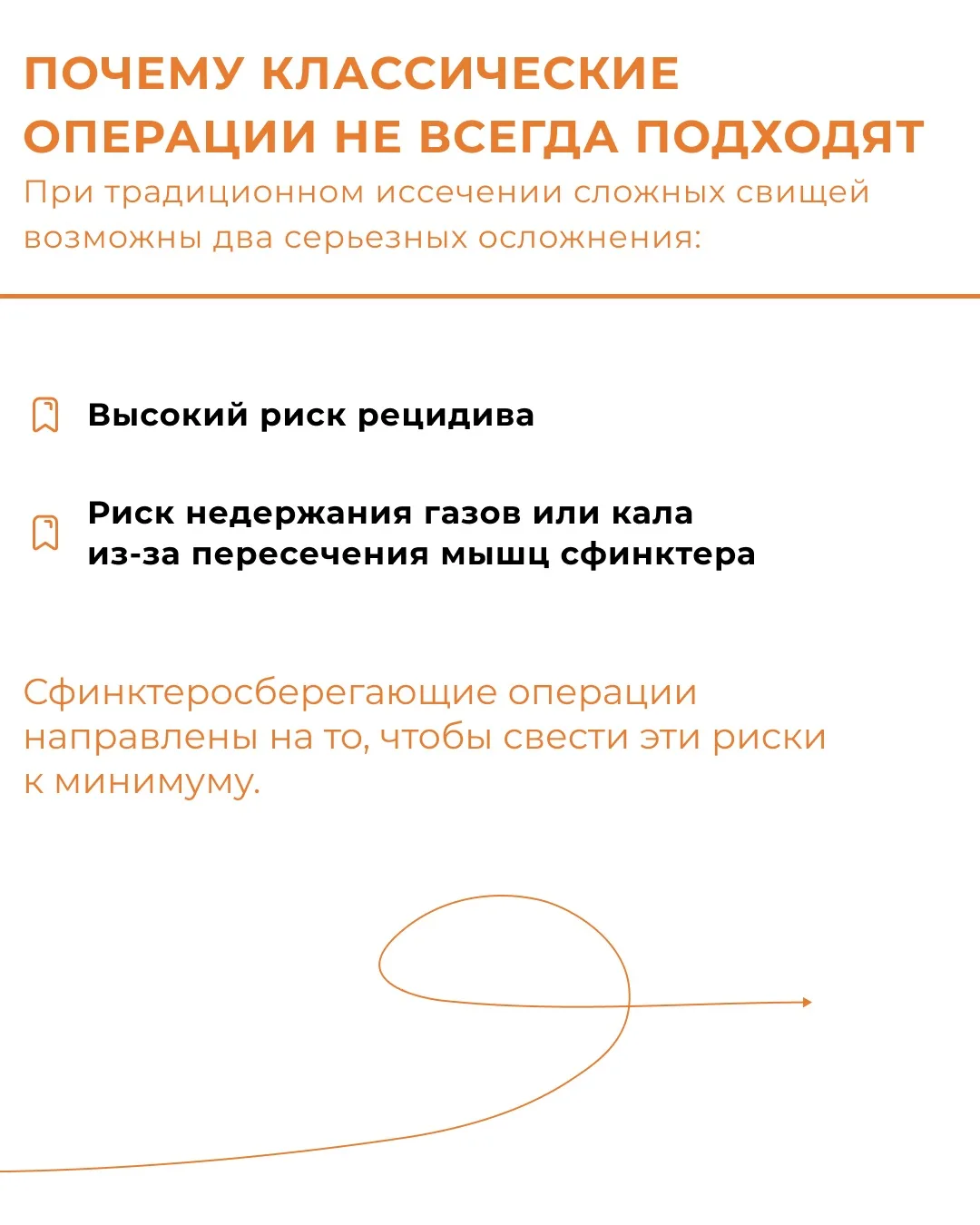 Сложные свищи требуют особого подхода. Классические операции в таких случаях могут быть связаны с риском рецидива и нарушением функции сфинктера, поэтому сегодня приоритетом становятся сфинктеросберегающие методики, направленные на радикальное лечение без потери качества жизни.
