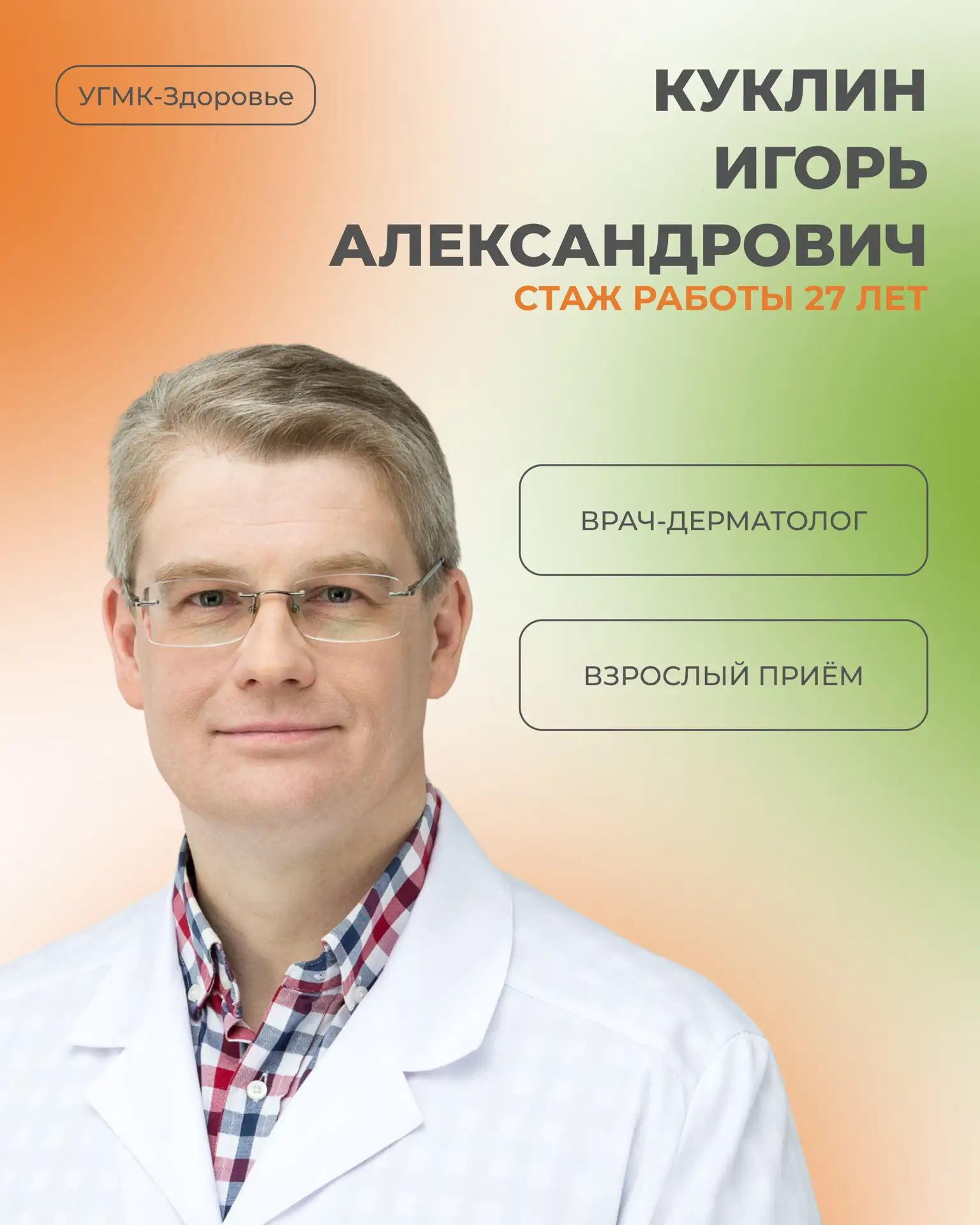 В клинике «УГМК-Здоровье» ведёт прием Куклин Игорь Александрович, врач-дерматолог высшей квалификационной категории, доктор медицинских наук, доцент.