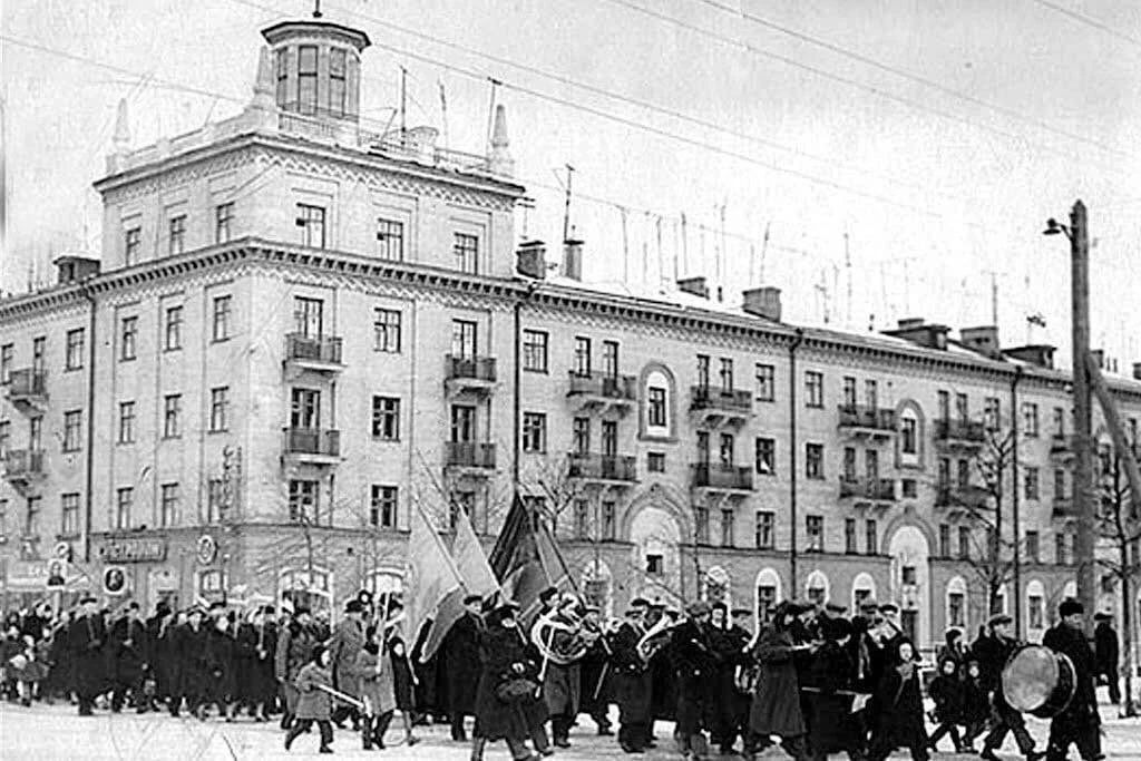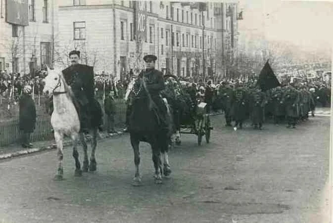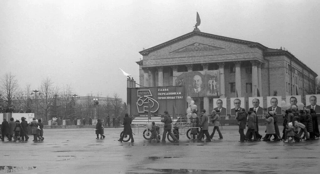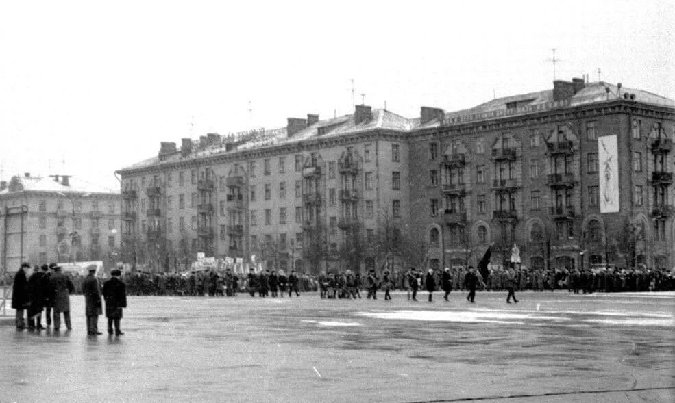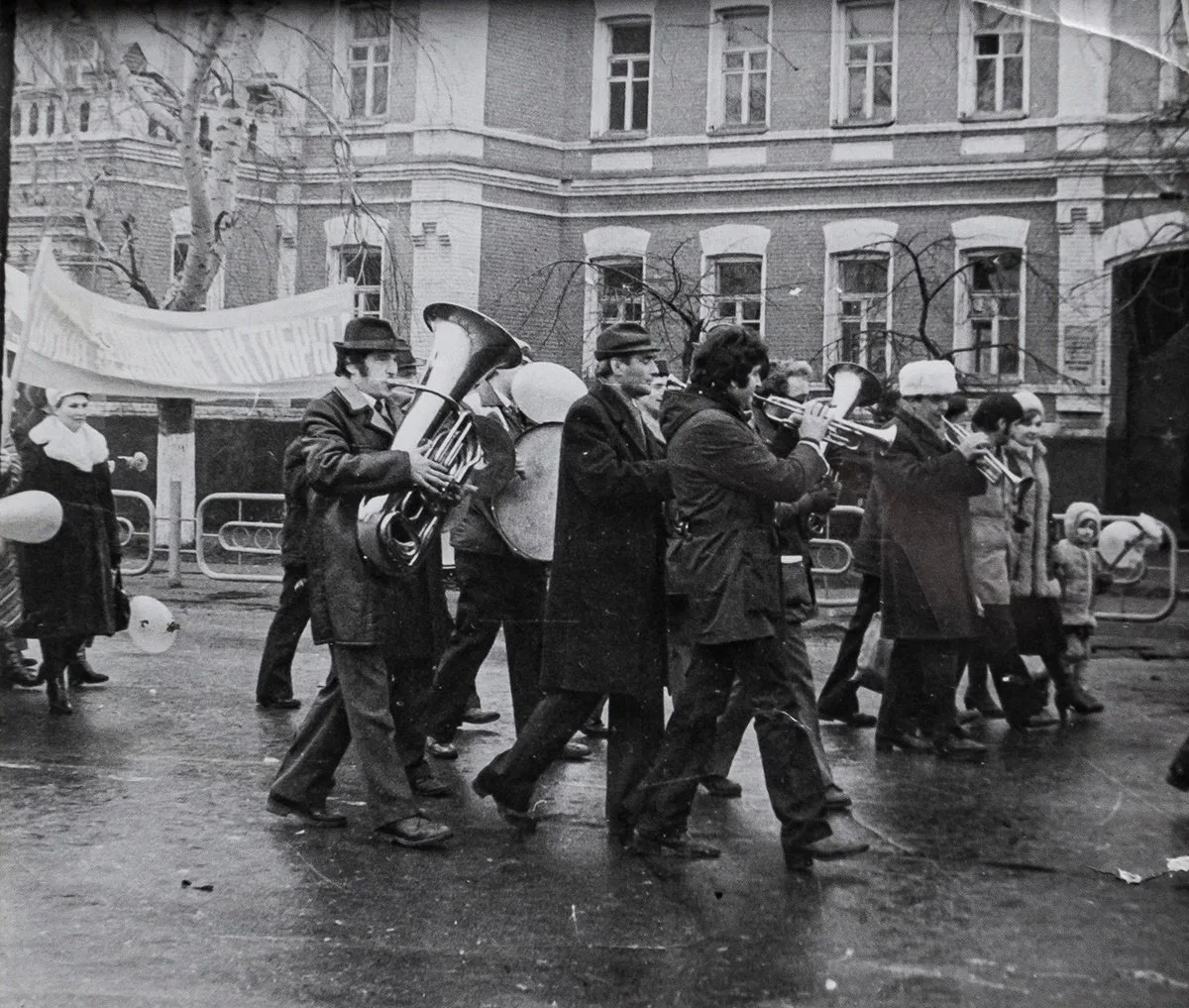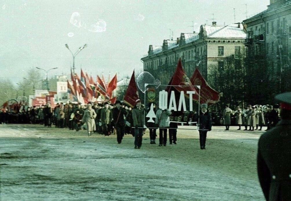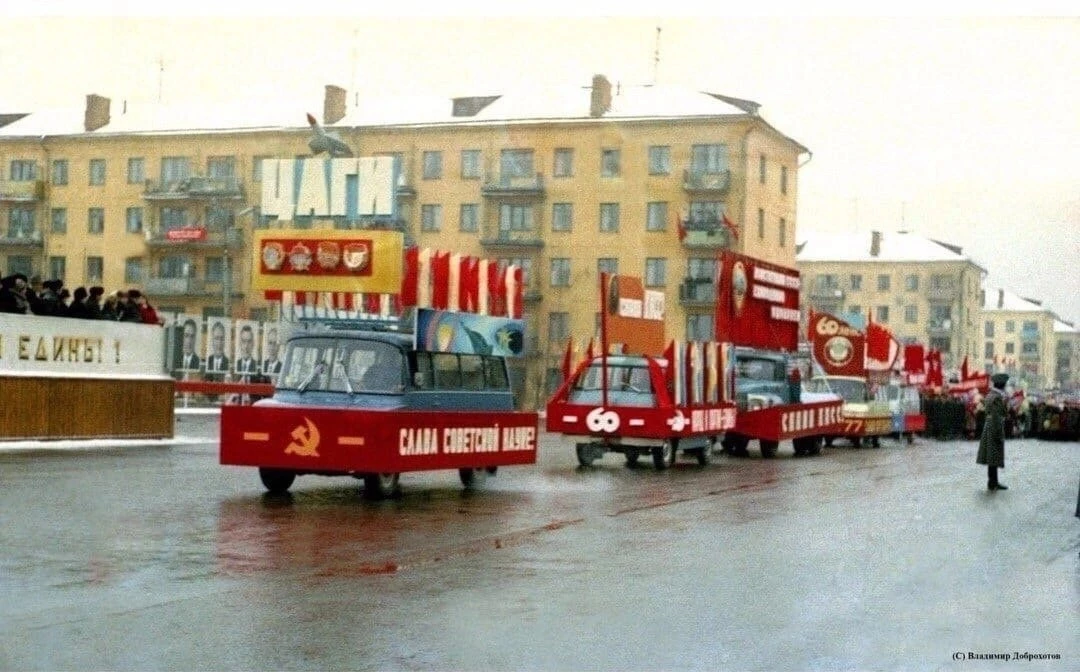 Демонстрация трудящихся и парад в честь победы Великой Октябрьской Революции, в советские годы проводилась 7 ноября. В любую погоду трудовые, студенческие и школьные коллективы шли на парад!