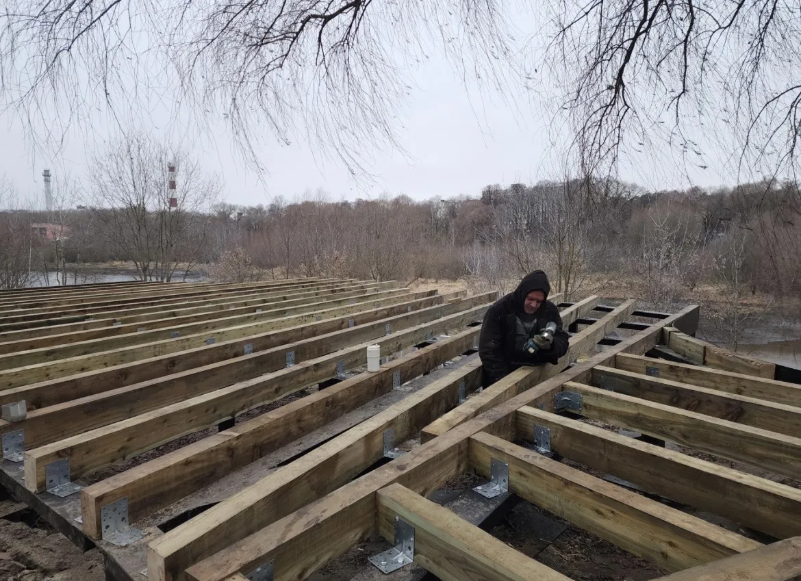 В данный момент специалисты подрядной организации занимаются устройством площадки для загара.