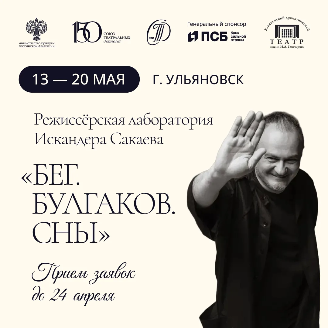 Союз театральных деятелей России совместно с Ульяновским драматическим театром имени И. А. Гончарова объявляют о начале приема заявок на режиссерскую лабораторию Искандера Сакаева «Бег. Булгаков. Сны».