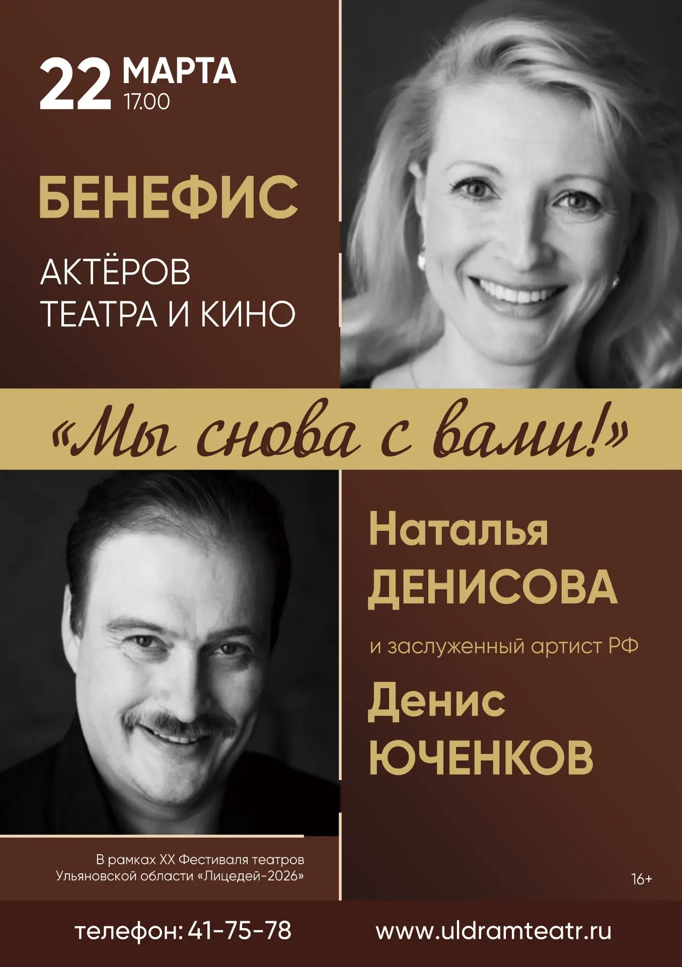 🎭 22 марта в 17:00 на Основной сцене Ульяновского драматического театра имени И.А.Гончарова - Бенефис артистов театра и кино Натальи Денисовой и заслуженного артиста РФ Дениса Юченкова «МЫ СНОВА С ВАМИ!» (16+, продолжительность 2 часа, без антракта)