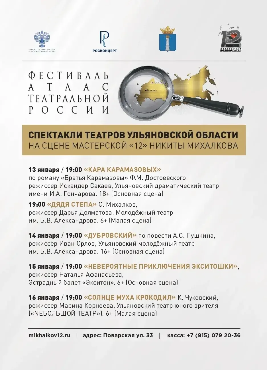 Фестиваль «Атлас театральной России» будет каждый месяц представлять в Москве театры всех регионов страны. По договоренности Губернатора Ульяновской области Алексея Русских и народного артиста России Никиты Михалкова первой приглашение в столицу получила Ульяновская область, и афишу Фестиваля 13 января открыл Ульяновский драматический театр имени И.А.Гончарова.