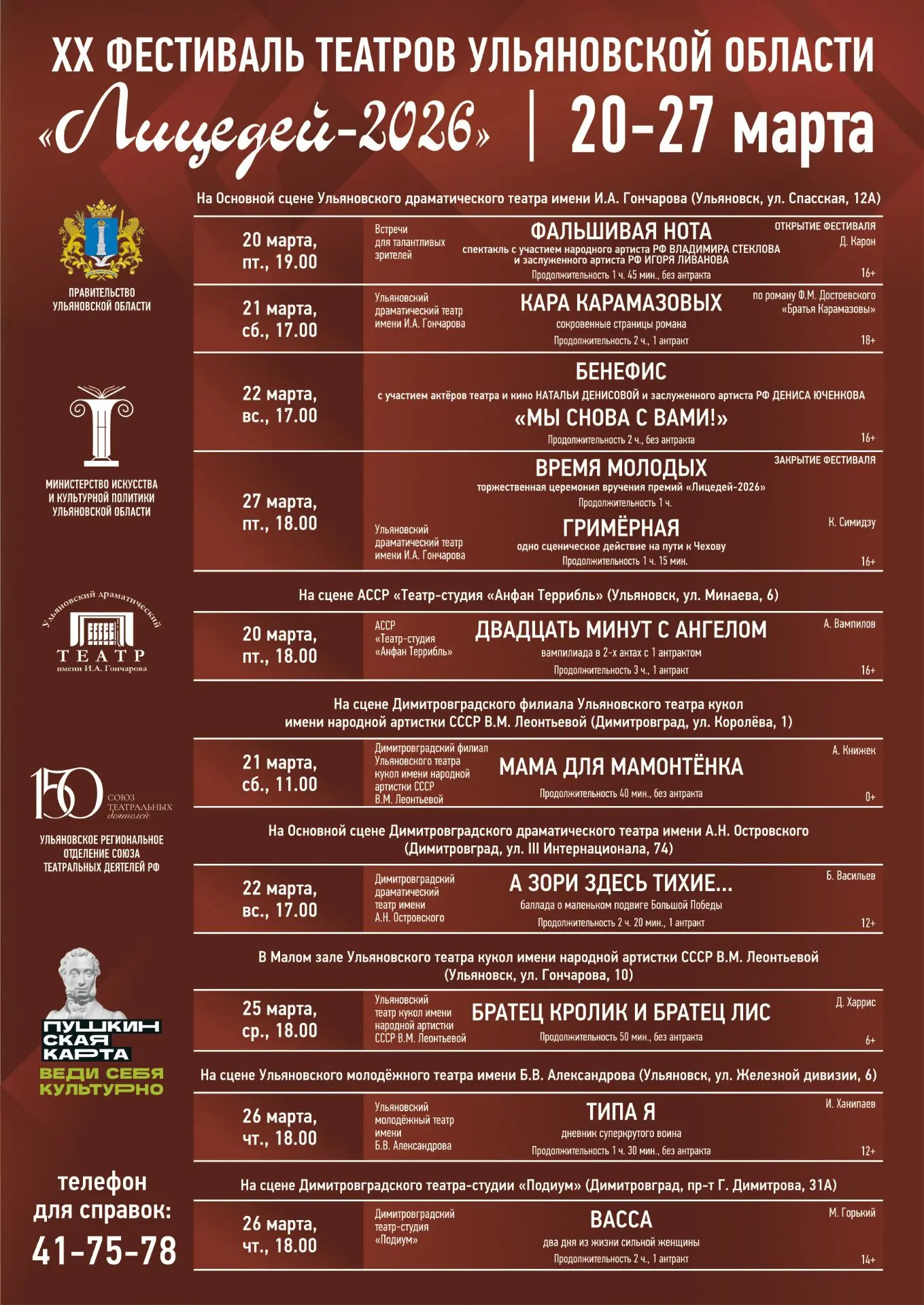 Юбилейный ХХ Фестиваль театров Ульяновской области «Лицедей-2026» пройдет с 20 по 27 марта на сценических площадках региона. Программа Фестиваля посвящена 150-летию Союза театральных деятелей Российской Федерации и пройдет под девизом «Время молодых». Сохраняйте афишу - и до встречи на лучших премьерах 2025 года!