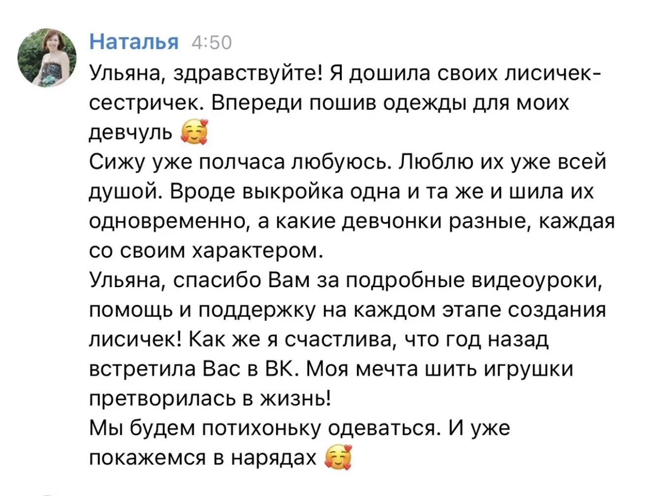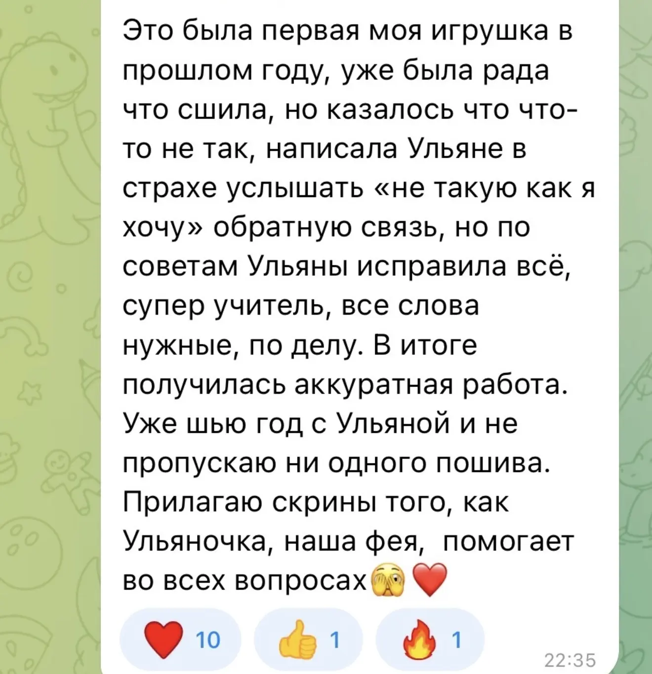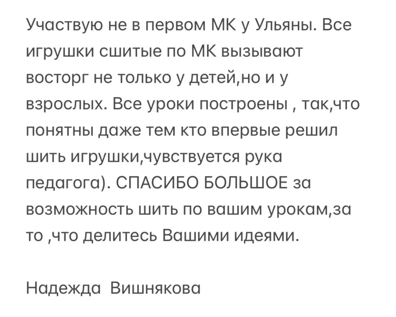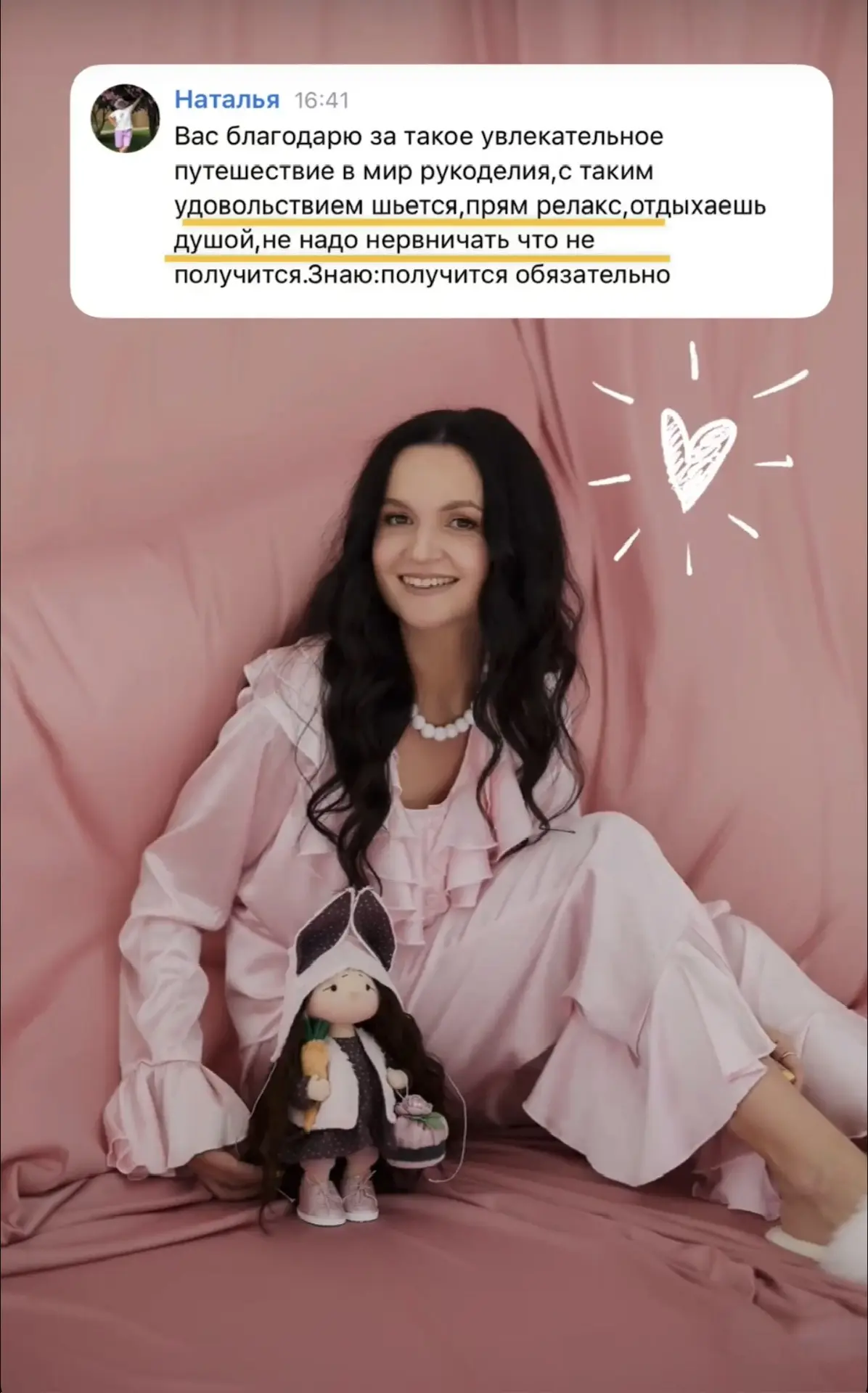 💬 «Спасибо за подробные видеоуроки, помощь и поддержку на каждом этапе пошива! Моя мечта шить игрушки претворилась в жизнь!» — Наталья.