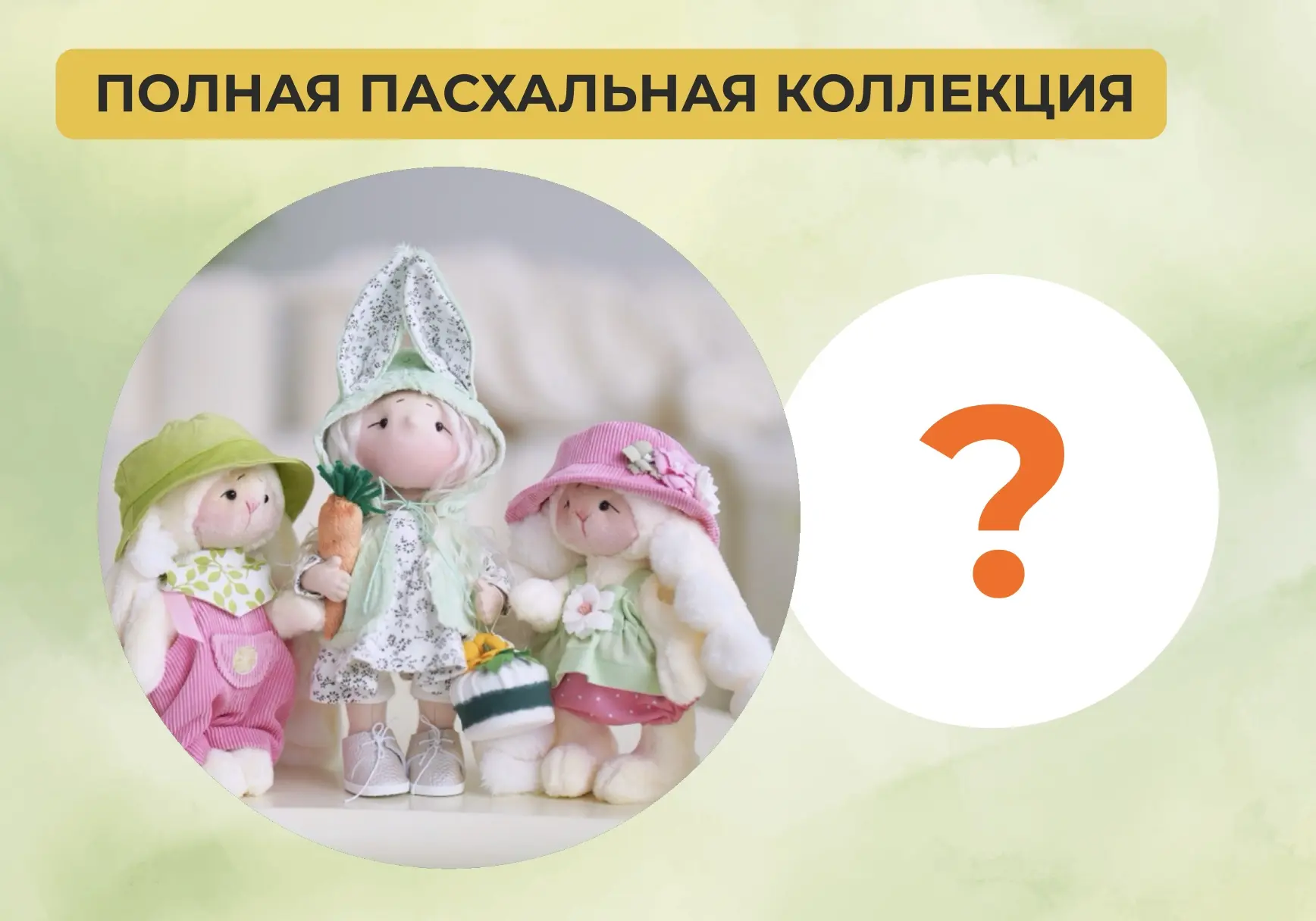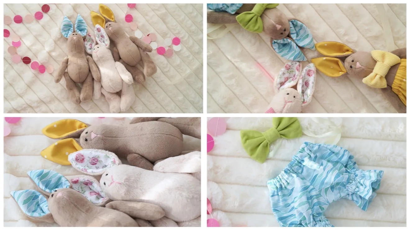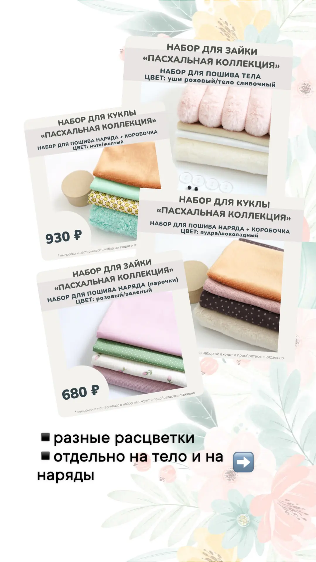 - готовые наборы для пошива заек и куклы: разные расцветки, отдельные наборы на игрушку/куклу и наряды