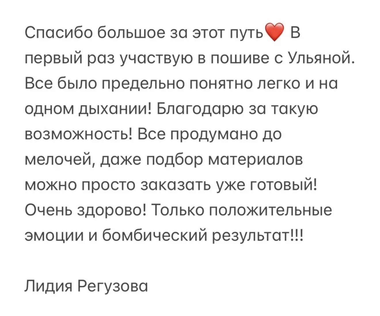 👉 И самое главное — вы не останетесь одна: на пошиву я лично курирую каждую участницу от первого до последнего урока.