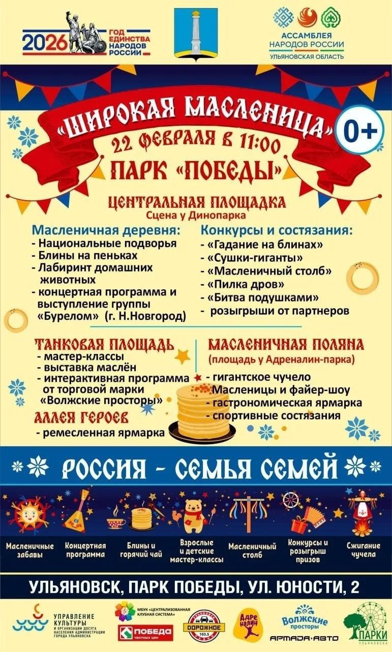 «Горящие пеньки», лабиринт с курами и выступление персонажа «Наденька Кадышева»: полная программа празднования Масленицы в Ульяновске.