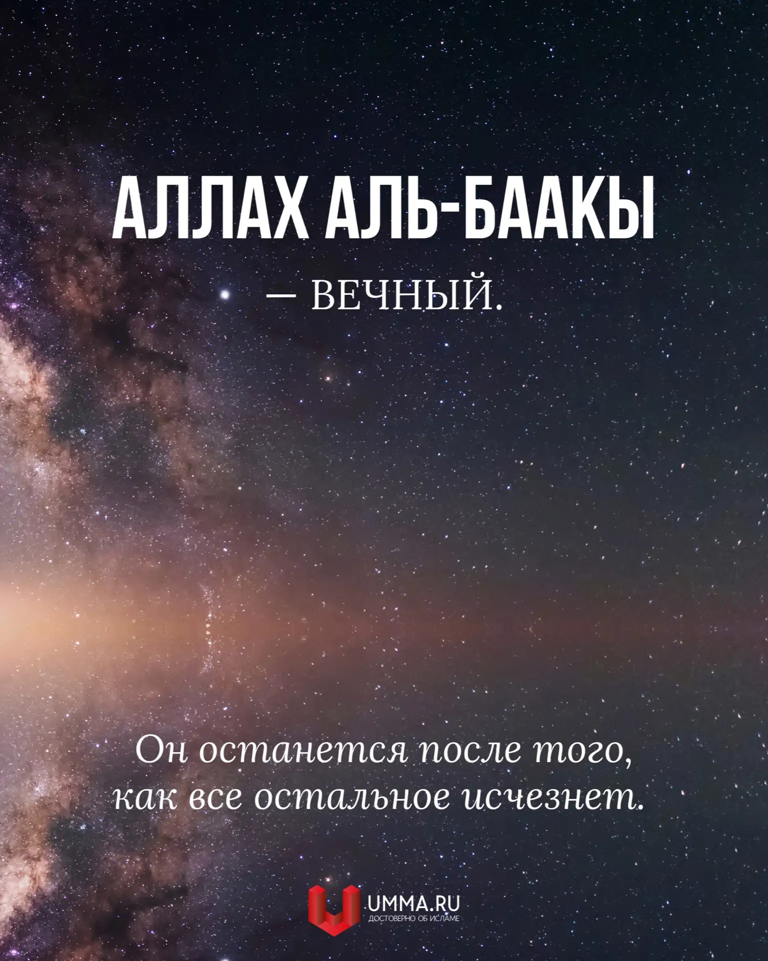 У всего в этом мире есть конец: времена, хорошие ли они или плохие, отношения между людьми, сама жизнь. Такова природа мира. Всякий раз, когда что-то в этом мире заканчивается и мы чувствуем себя немного опустошенными или разбитыми, следует напоминать себе, что мы должны держаться Аллаха (Бога, Господа), потому что Он — аль-Баакы, Вечный.