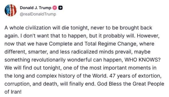 "Ночью Иран погибнет. Не станет целой цивилизации, её не вернут обратно", — анонсировал Трамп в своих соцсетях.