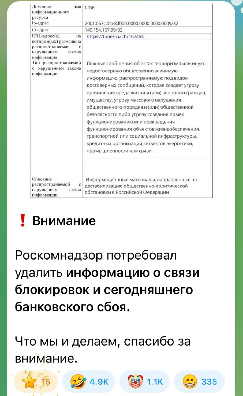 РКН попросил ребят из Двача удались информацию о возможной связи блокировок и сегодняшнего банковского сбоя.