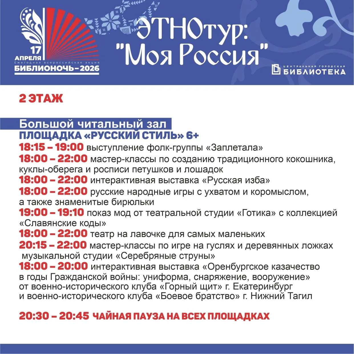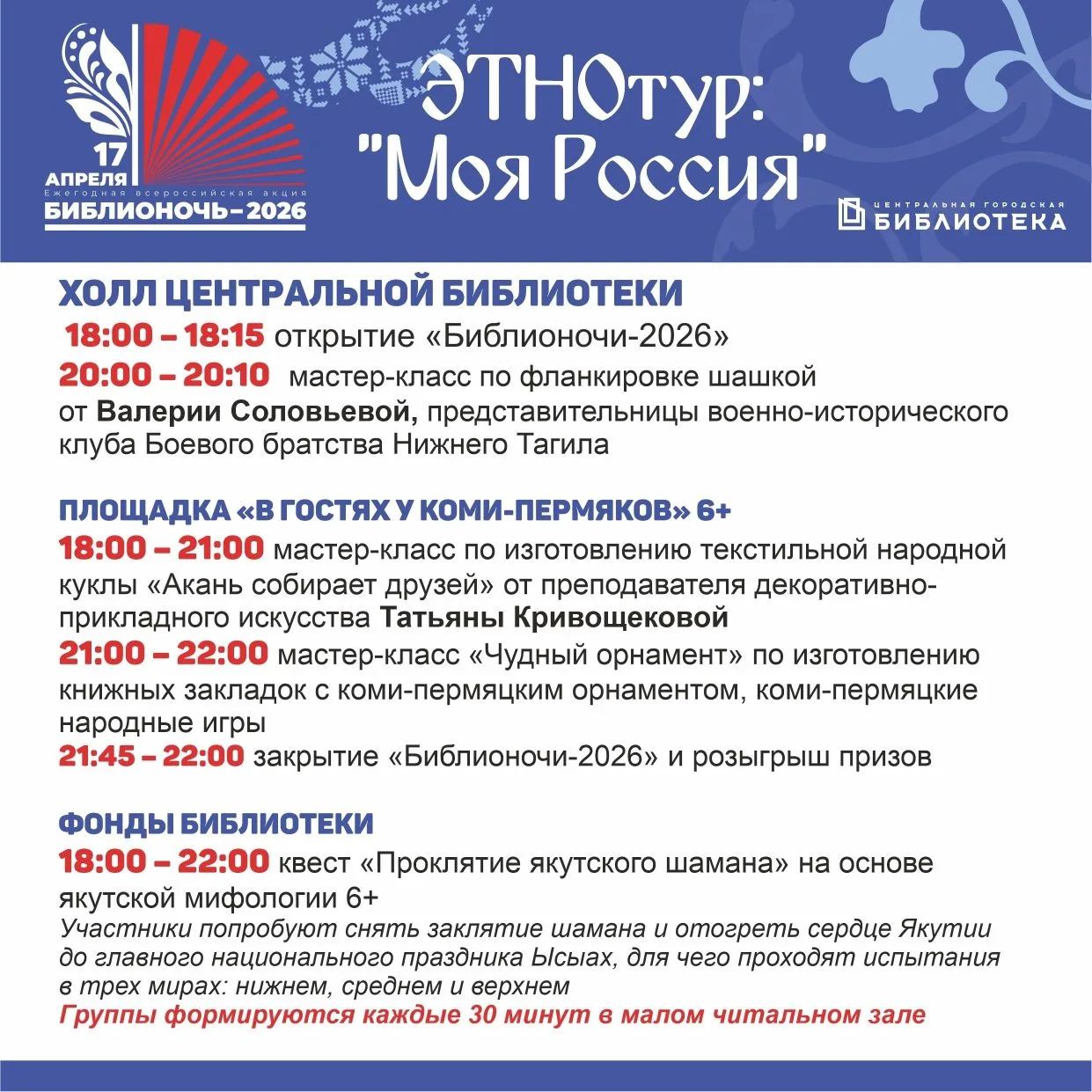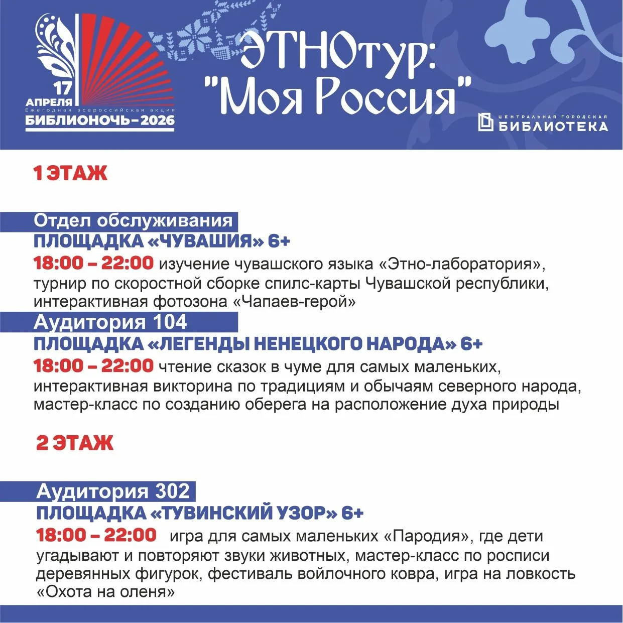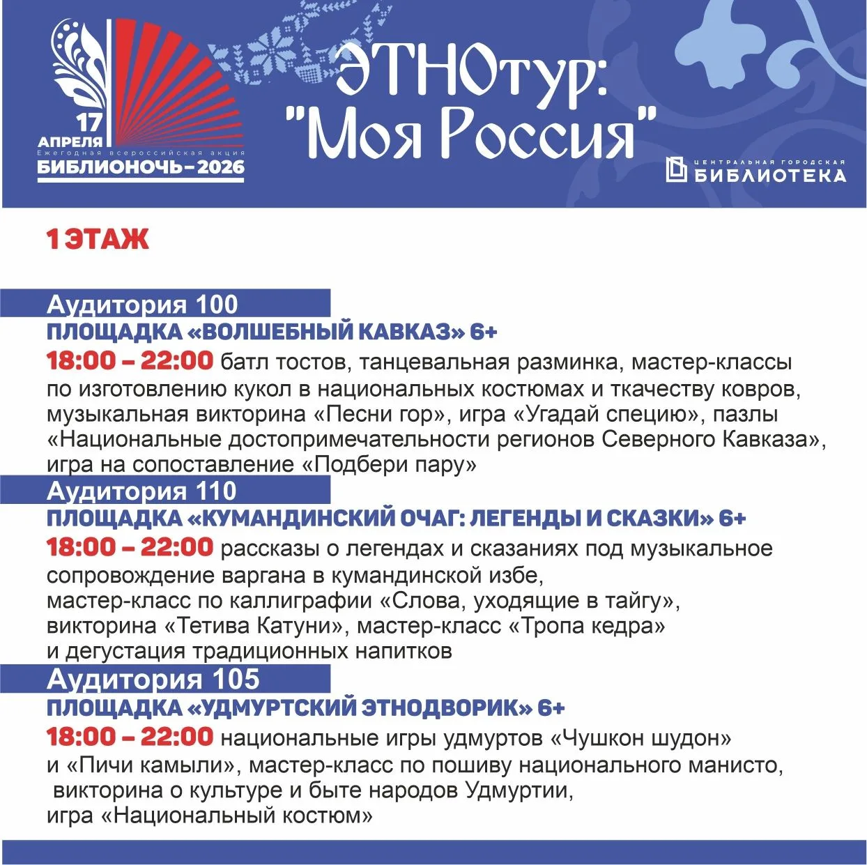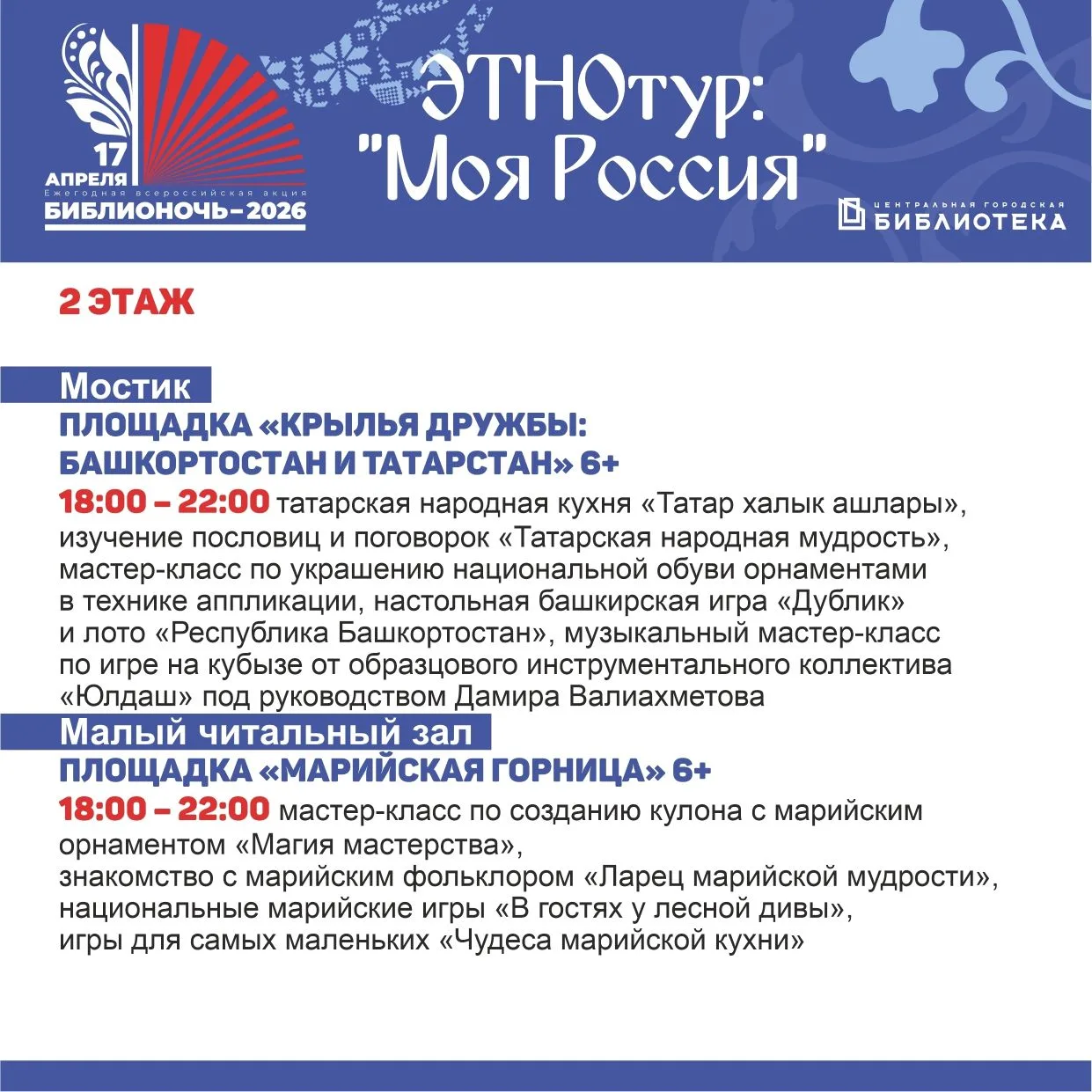 ⭐ С 18:00 до 22:00 гостей ждет погружение в историю, традиции и обычаи разных народов нашей страны – удмуртов, марийцев, тувинцев, кумандинцев и других. Для желающих – дегустация блюд национальных кухонь, знакомство с традиционной музыкой, возможность освоить несколько фраз на разных языках, чтение легенд и сказок.