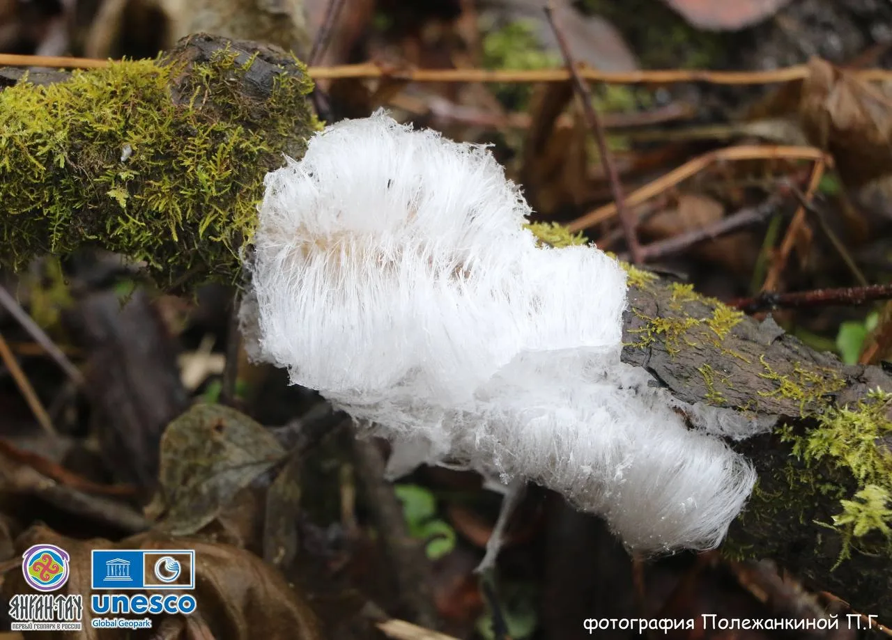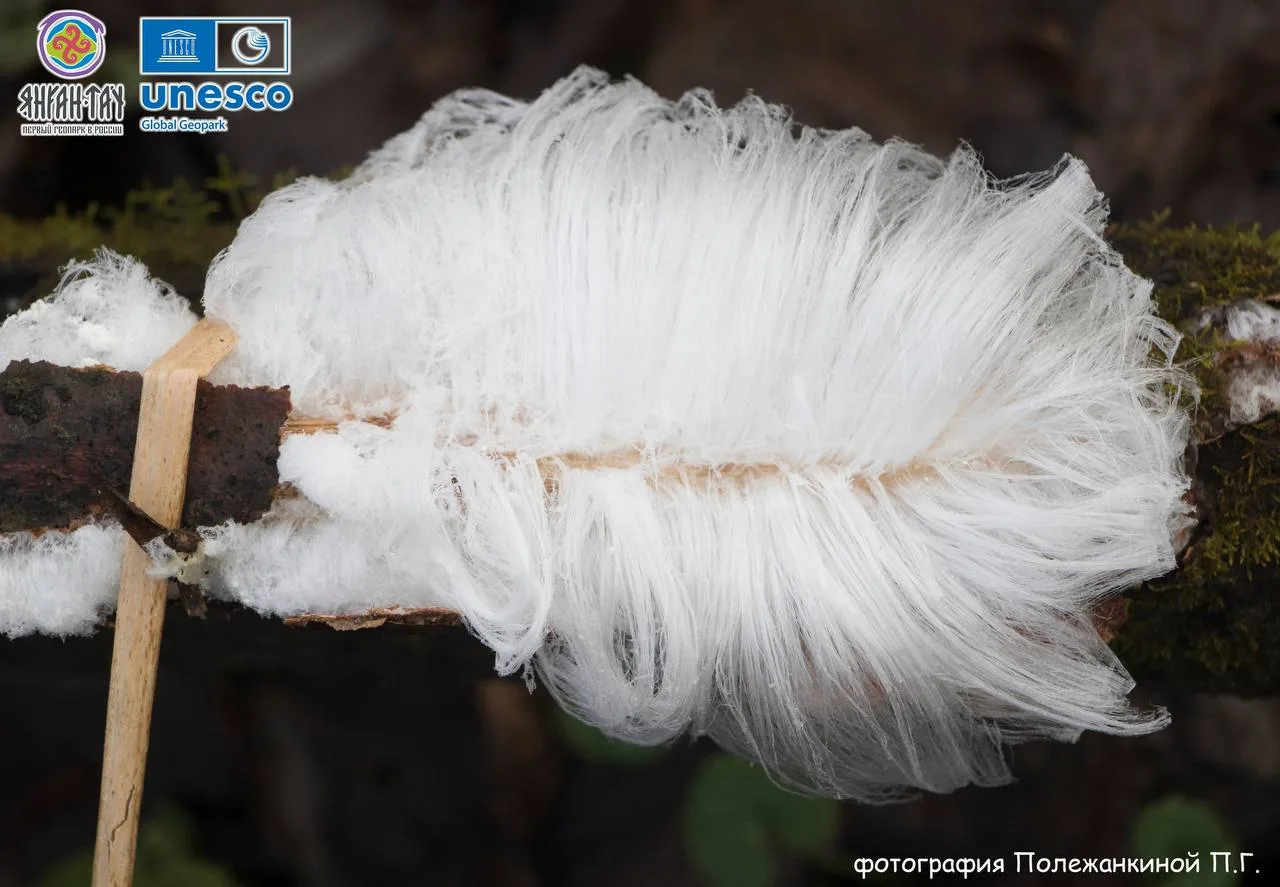 Такая редкость появилась в геопарке «Янган-Тау» в Башкирии. Пряди выросли на гниющем дереве, которое поражено грибом Exidiopsis effusa. Он мешает льду превращаться в обычные кристаллы, и замерзшая вода выходит наружу тончайшими «волосками».
