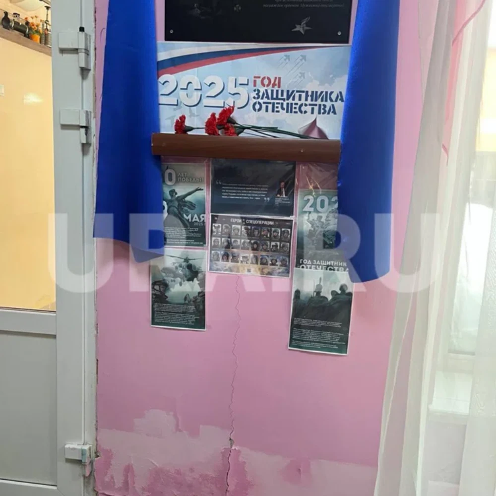 Даже памятный уголок для погибшего бойца СВО оказался в потеках и трещинах. Единственным опрятным местом в школе являлся кабинет Данилова, в котором одна из стен была украшена иконостасом и памятными сувенирами.