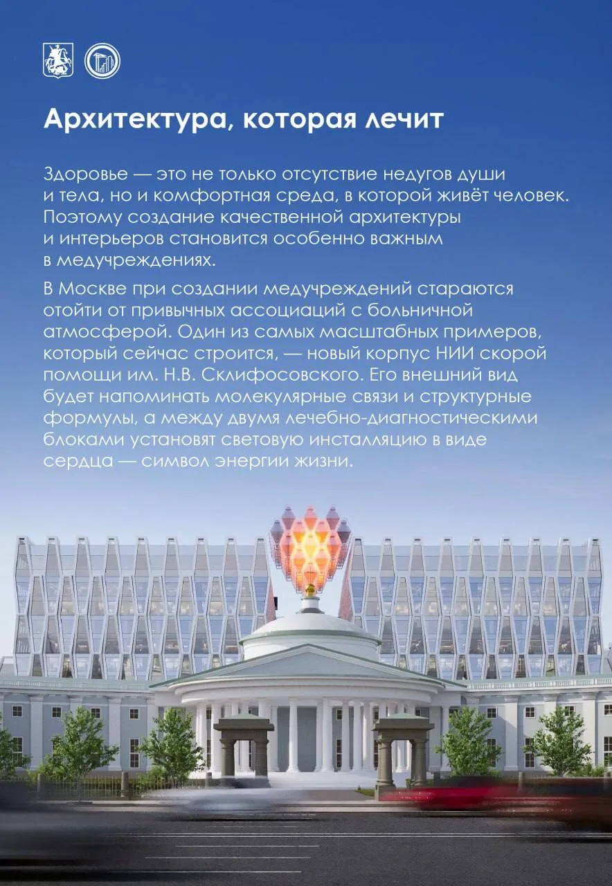 Сегодня я хочу показать вам архитектурную концепцию нового корпуса НИИ им. Склифосовского — проект, над которым я работаю вместе с бюро «Камень». Для меня это не просто проект новой больницы, а пример того, как может выглядеть современное медицинское пространство мирового класса в Москве.
