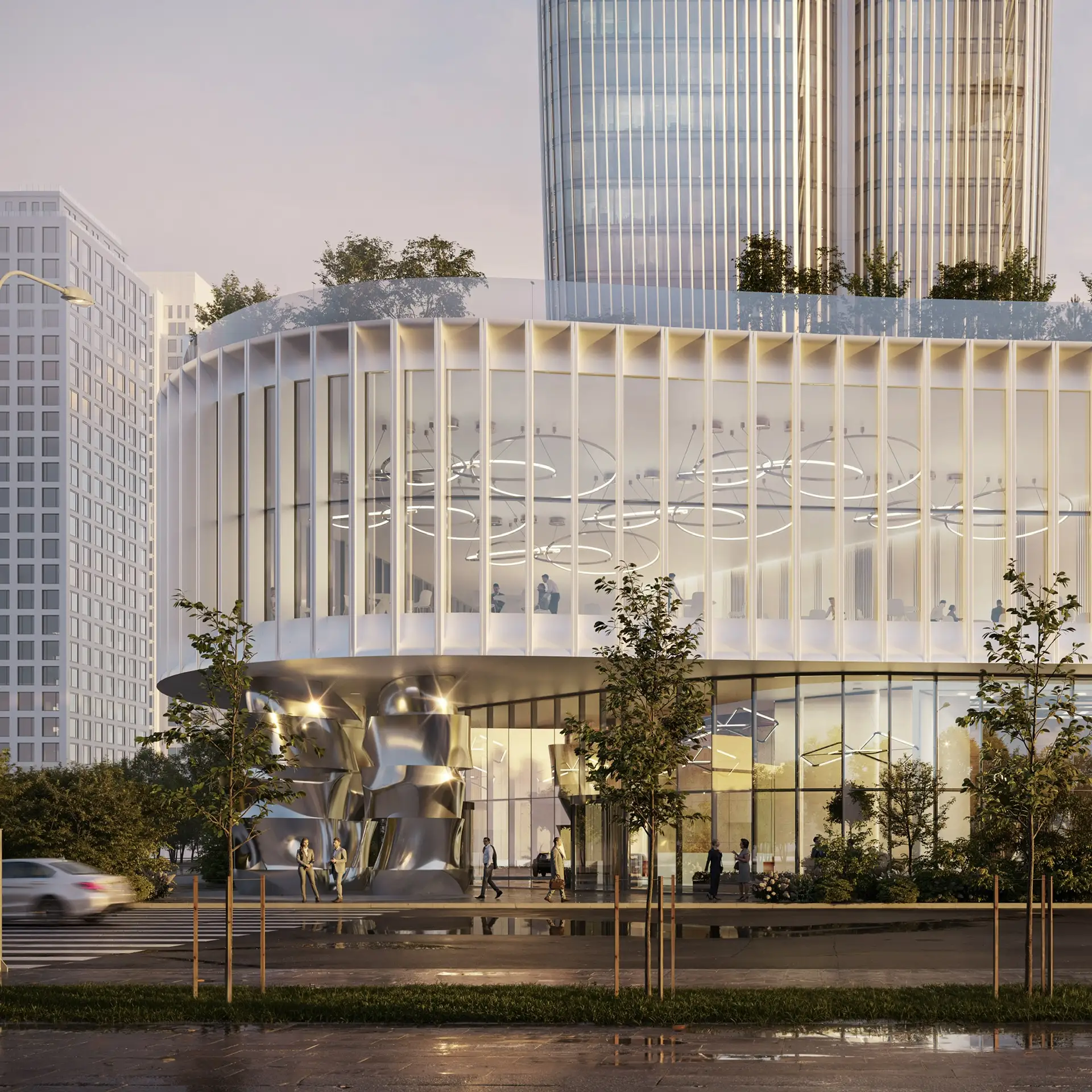 Главный вход будет развернут к парку и историческому корпусу – Староприимному дому. Над входом появится световая инсталляция — пульсирующее «сердце», символ энергии и жизни. Это станет главным акцентом всей композиции.