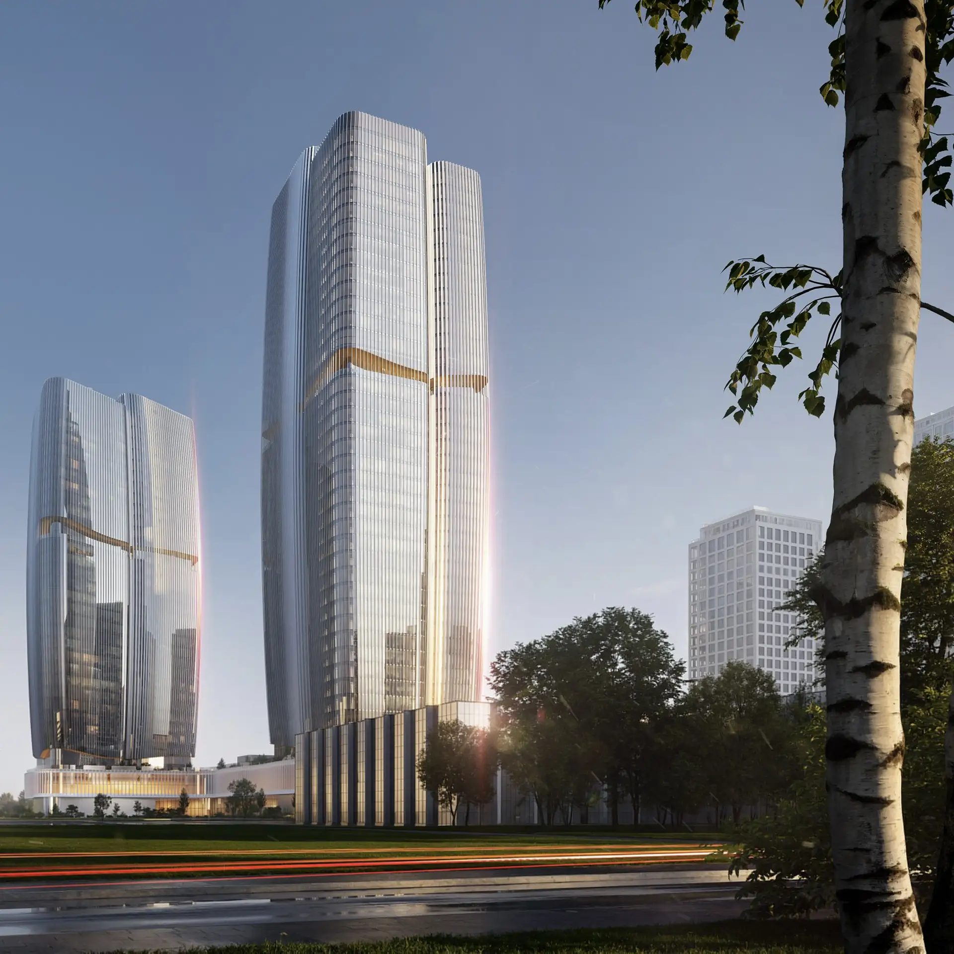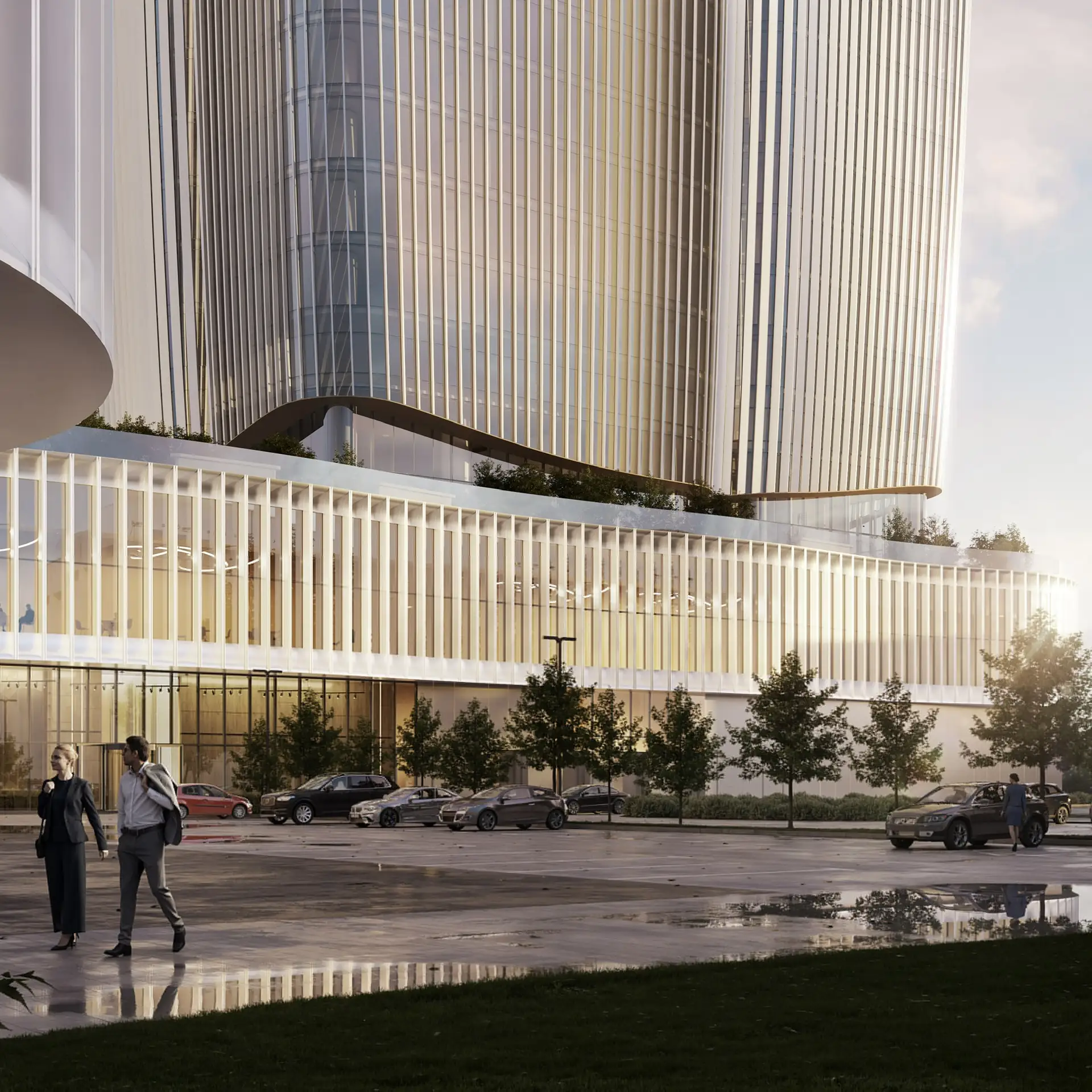 Две разновысотные башни, объединённые многоуровневым общественным стилобатом, сосредоточат деловую и общественную активность в одном городском узле. «Поле» — это и отсылка к локации, и символ «поля деятельности», и знак преемственности контекста.
