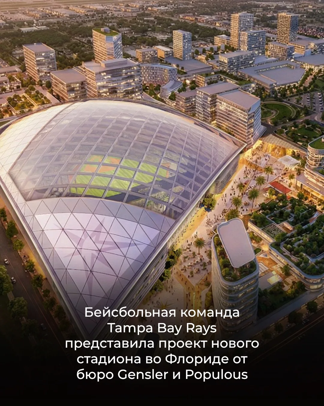 🌐 Бейсбольная команда Tampa Bay Rays представила визуализацию нового стадиона в американской Флориде от архитектурных бюро Gensler и Populous, который станет самым маленьким в лиге, вмещая всего 31 000 зрителей. Если проект будет одобрен, то строительство должно завершится уже в 2029 году. Центральным элементом дизайна станет эллиптическая арка с решетчатой полупрозрачной крышей, повторяющей форму игрового поля.
