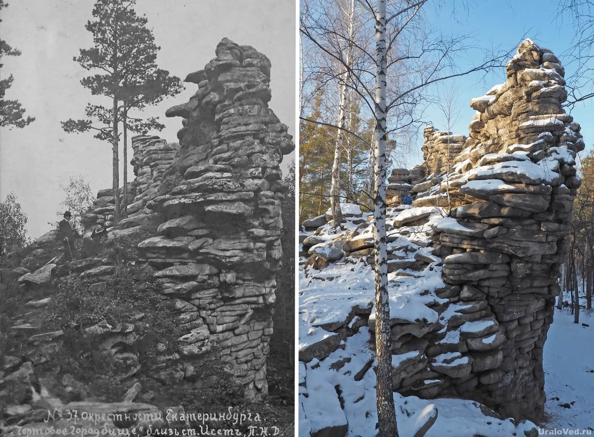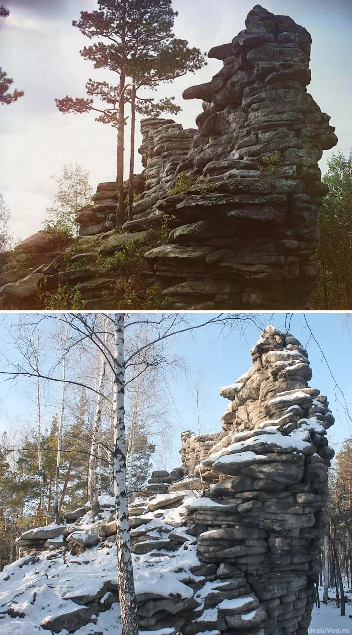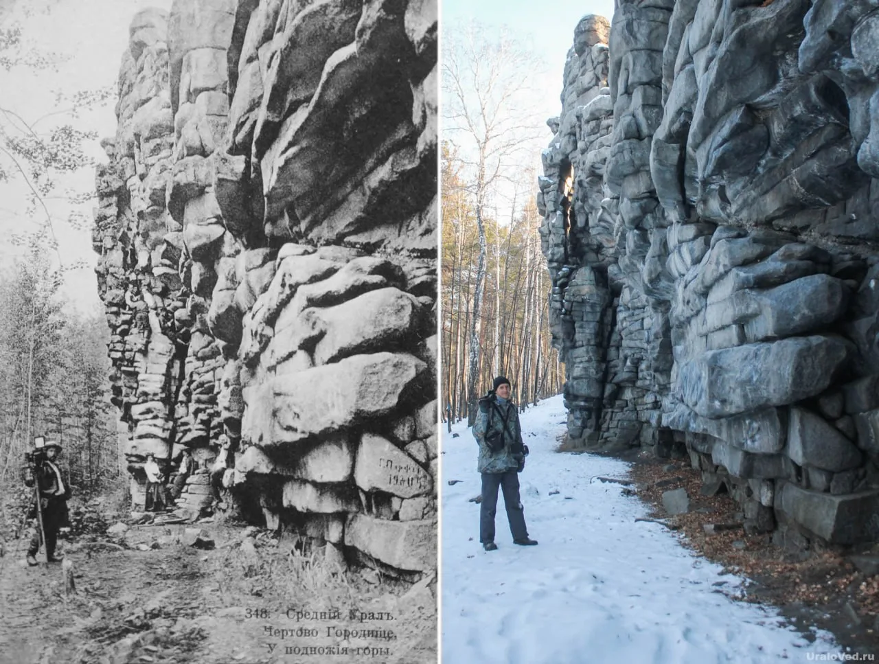 Скала Чёртово Городище на фото С.М. Прокудина-Горского 1909 года и в наши дни.