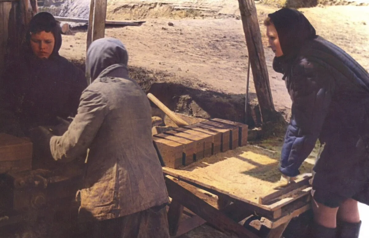 Спускаемся по другой лестнице вниз. Здесь прессуется кирпич. Я интересуюсь узнать, какая выработка прессовщика.