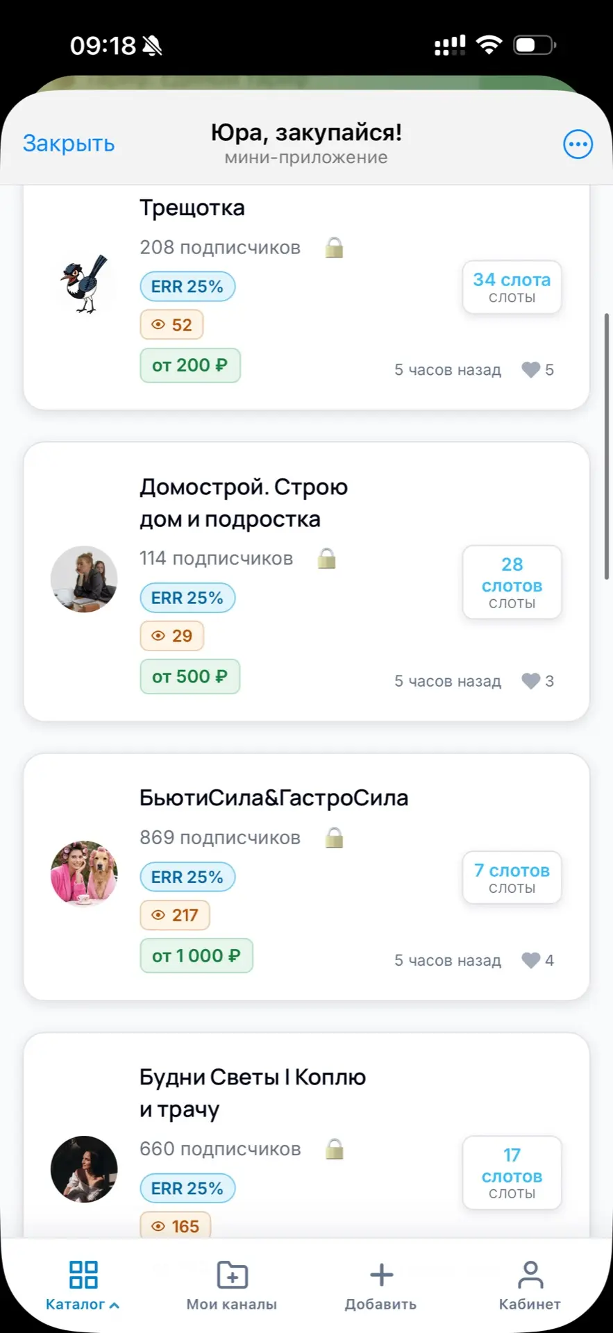 Самое главное там: доступ к приложению Юра, закупайся! - биржа/маркетплейс слотов на рекламу в телеграм и максе, где без комиссии и лишних переписок вы находите слот на нужную вам дату и по нужным параметрам канала. Только проверенные нами авторы, за три года существования комьюнити мы точно знаем у кого покупать хорошую рекламу.